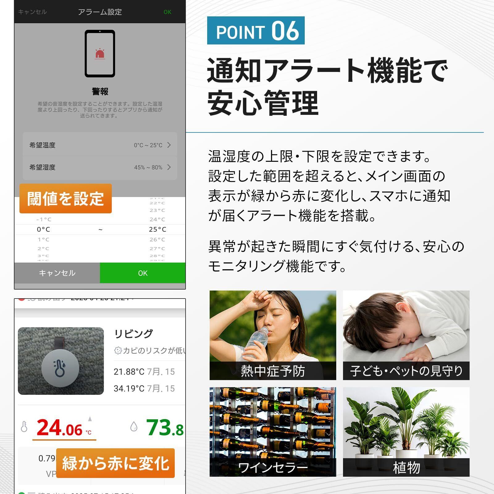 【アラーム機能】設定された温湿度範囲を超えると、スマートフォンに通知し、注意喚起する機能を搭載しています。温度範囲は-20℃から65℃まで対応しているので、リビング、寝室、ベビールーム、オフィスの他、冷蔵庫、バルコニー、車、シガーボックス、ペット用ベッド、薬箱など異常を検出したい場所にセットしておけば、安心して生活できます。