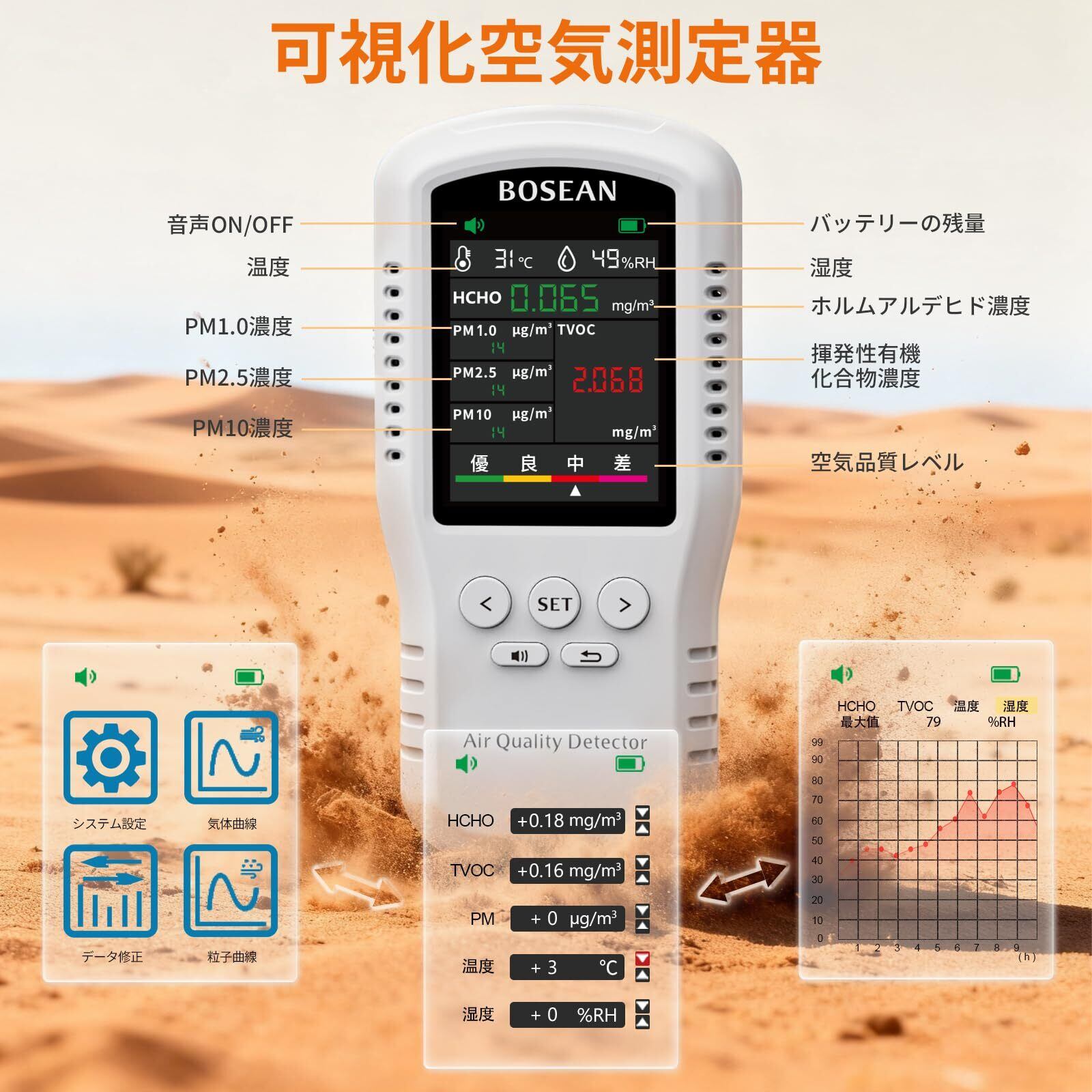 BOSEAN 臭気測定器 空気測定器 測定器 pm2.5 TVOC HCHO 温度 湿度 臭気計測器 データで視覚化 ホルムアルデヒド ブレスチェッカー 匂いチェッカー 臭いセンサー 匂いセンサー 測定 ニオイチェッカー 匂い測定器 LCD大画面ディスプレイ 多機能 室内空気質モニター 空気質検査器 家庭 オフィス 倉庫 台所 車 日本語と英語 切り替え可能 USB充電