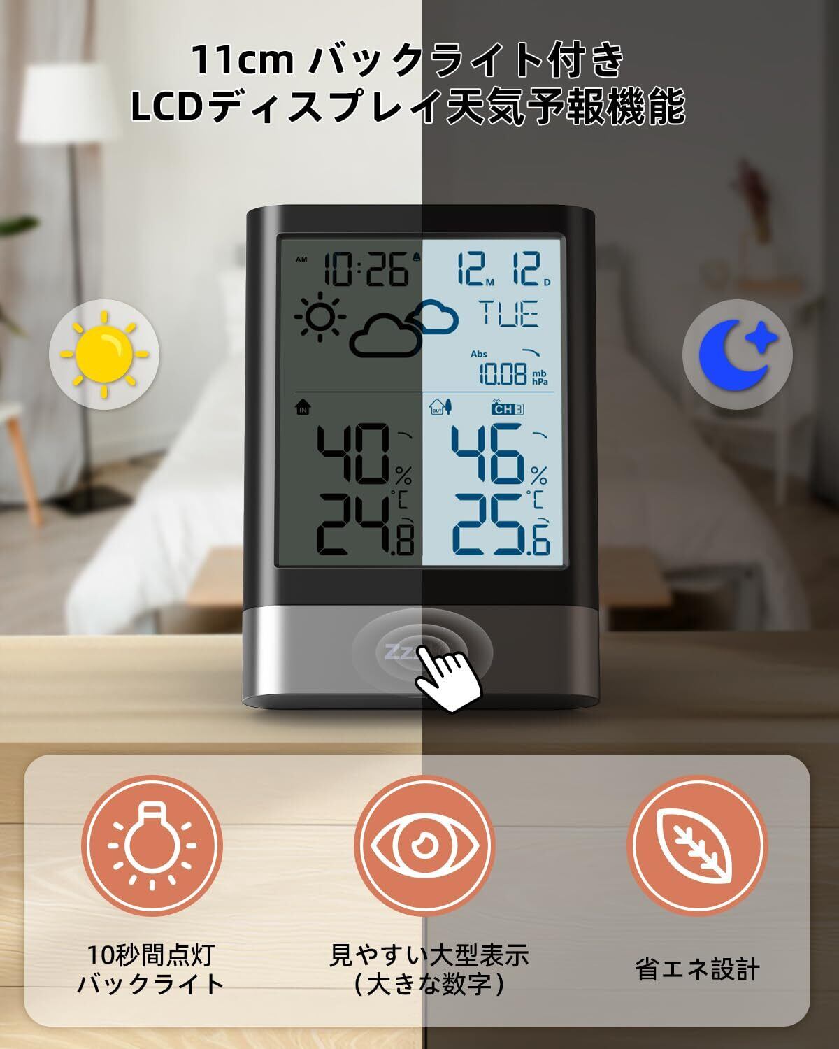 温湿度計 室内 屋外用 デジタル 温度計 湿度計 ワイヤレス 高精度 天気予報 手動時計設定 LCD大画面 バックライト 最低/最高記録 快適度表示 トレンド 霜警報 ℃/℉切替 アラーム スヌーズ 卓上・壁掛け対応 コンパクト 熱中症・乾燥対策 赤ちゃん 高齢者向け