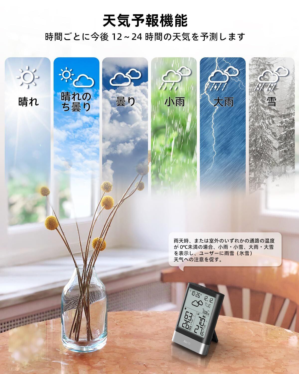 【気圧&天気予報で先読み対策】本機は気圧変化に基づき、今後12~24時間の天気を予測可能。晴れ・曇り・雨・雪などのアイコンで直感的に表示され、洗濯や外出、農作業の計画に便利です。天気予報は屋内外の環境変化にも対応し、快適な生活をサポートします。