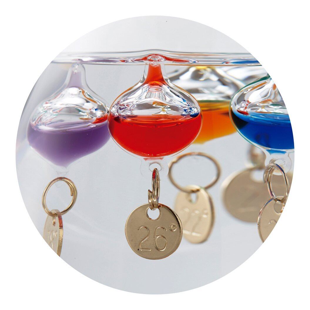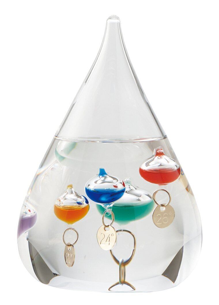 不思議な化学変化や現象をインテリアとして楽しめるFun Science(ファン・サイエンス)シリーズ。物理学者のガリレオ・ガリレイが発見した原理に基づいて作られたガラスフロート温度計。液体の比重が気温によって変化すること利用し、上下するガラス球体が気温を示す。上部に移動したガラス球体の中で、一番下のガラス球体に付いたタグが現在の気温となる。