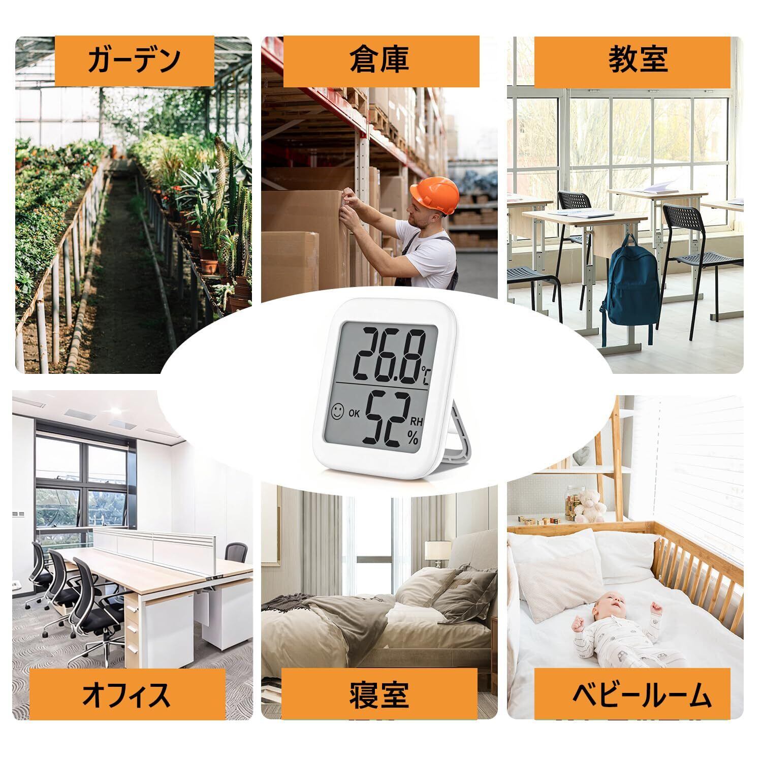 【製品仕様】サイズ:68㎜×74㎜×15㎜ 53グラム。この室内用温湿度計は、室内の温度と湿度をリアルタイムで監視できます。温度測定範囲:華氏 - 58~158 度(摂氏 - 50~70 度)、湿度測定範囲:10%~99%。測定間隔:10 秒。