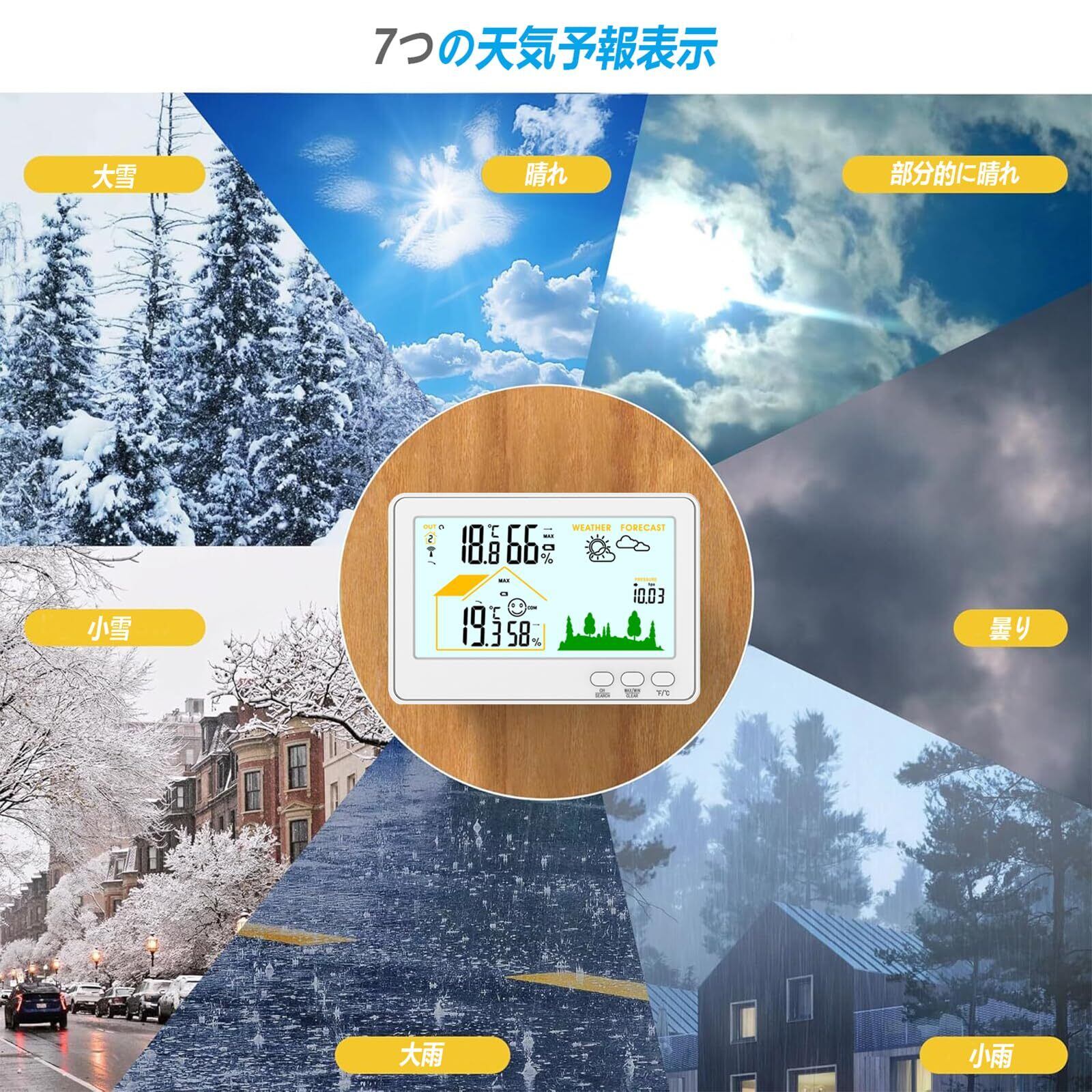 【天気予報機能】:もう天気を心配する必要はありません!屋内外の温度、湿度、気圧データをリアルタイムで取得。このワイヤレスウェザーステーションは、温度、湿度、気圧の変化を含む気象関連変数に基づいて、今後24時間の天気予報を計算し、あなたの場所の個人予報を生成します。