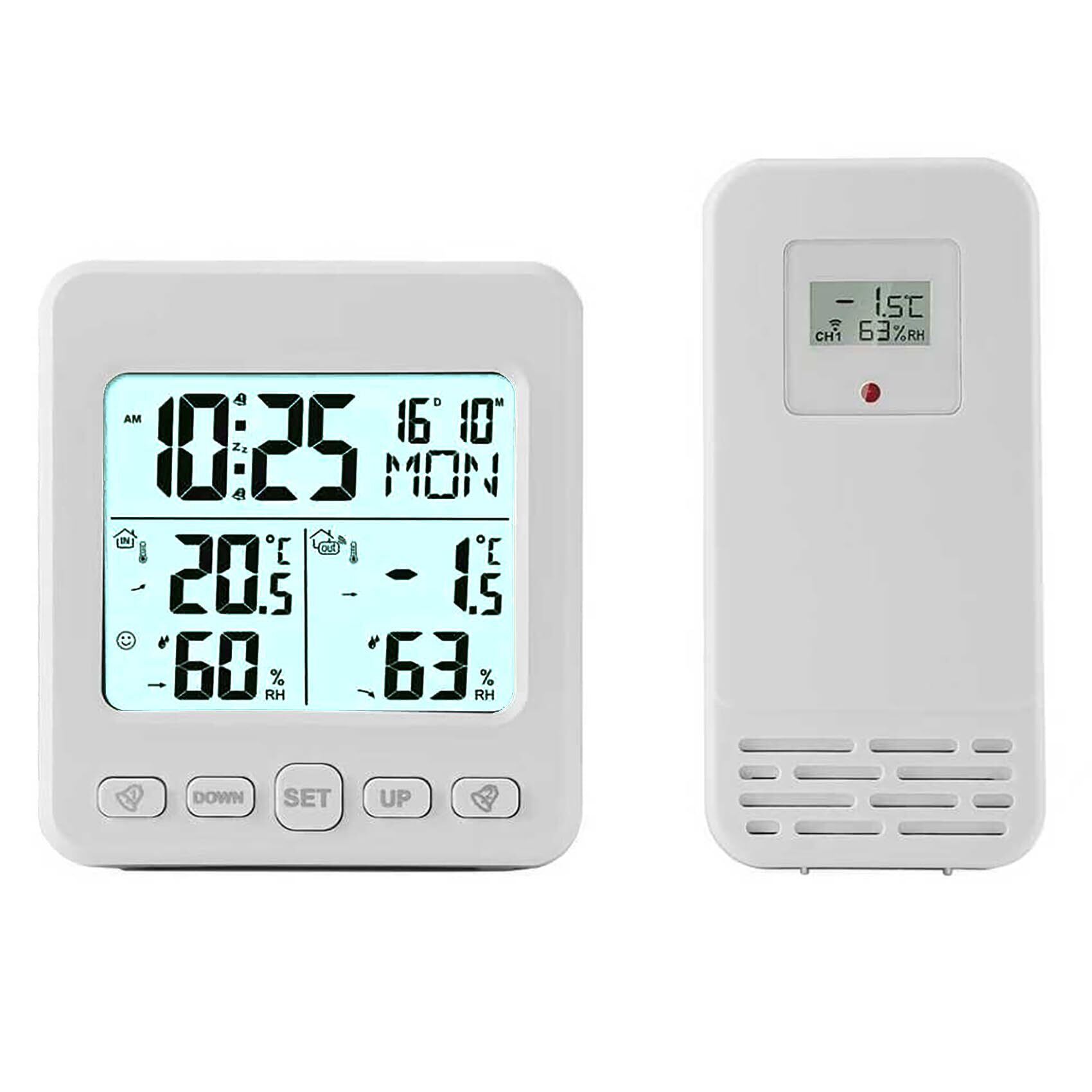 デジタル温度湿度計 室内/室外 ワイヤレス温湿度計 外気温湿度 アラームを2つ設定/時計カレンダー/バックライト/最高最低温湿度/快適レベル/温度と湿度傾向図/置き掛け両用 ホームオフィス温室倉庫使用 健康管理 温度管理 日本語取扱説明書