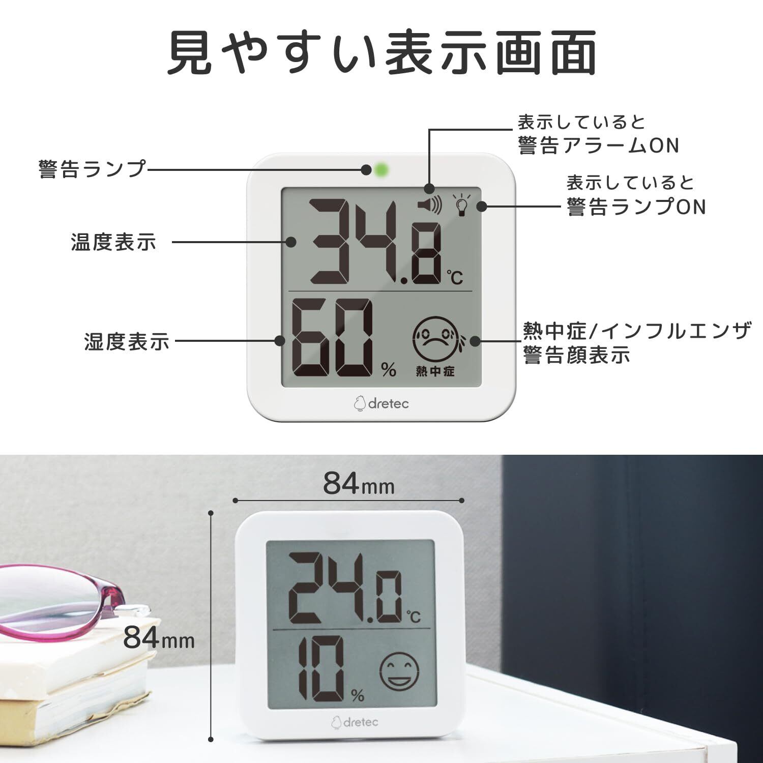 見える安心、守る健康、家族のための温湿度計。光でお知らせ、音でお知らせ、光と音は設定で変更できる、表情でお知らせ、熱中症・インフルエンザの危険度目安を表示