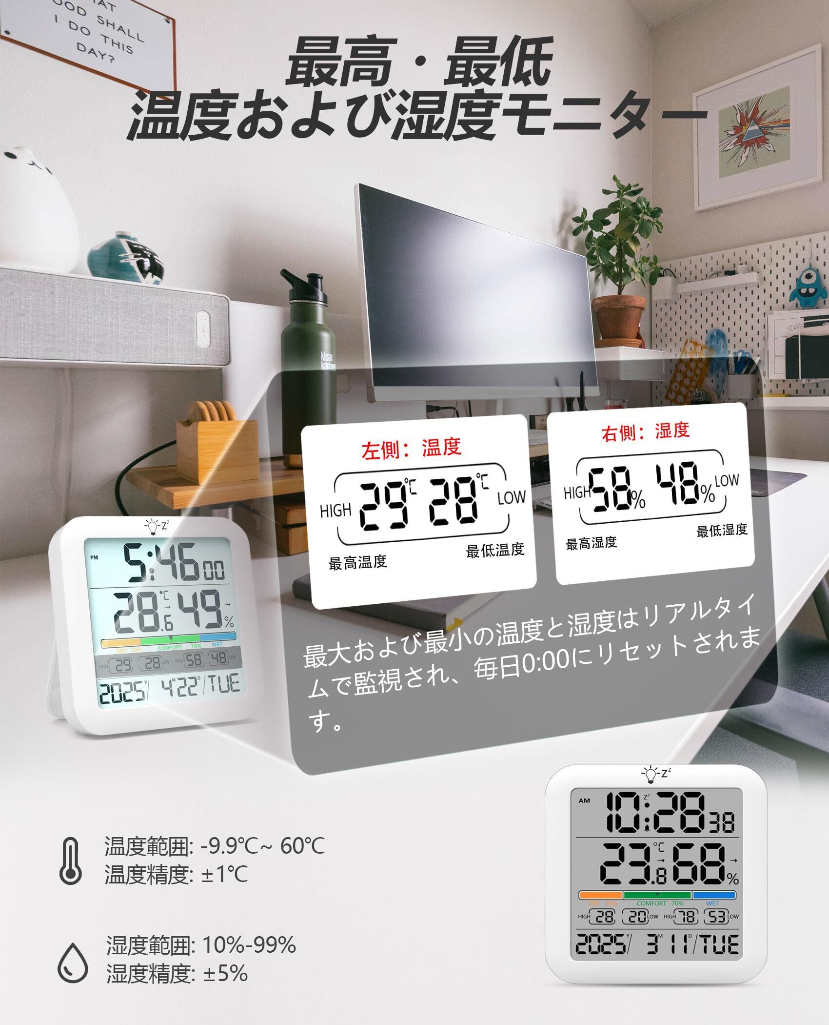 【温度・湿度測定範囲】温度範囲:-9.9~60℃、湿度範囲:10%~99%。温度と湿度の精度:±1℃/±5%。データは10秒ごとに自動更新され、環境の変化をリアルタイムで表示します。デジタル温度計・湿度計には、各日の最高・最低温度と湿度値を記憶する機能があり、毎日0:00にデータをリセットします。