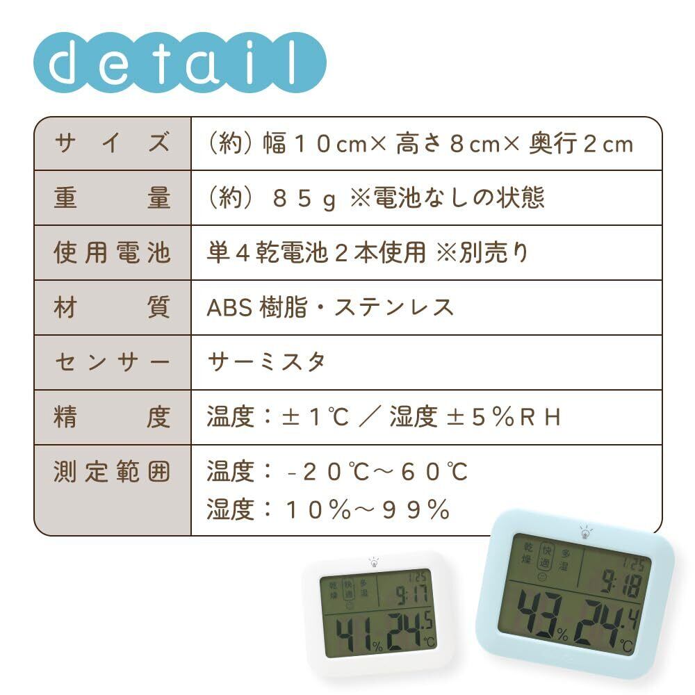 mitasのデジタル温湿度計は、リアルタイムでお部屋の湿度と温度を10秒ごとに計測。大きくて見やすい液晶画面に、時間・日付も表示される便利な機能付きです。数字がはっきり見えるので高齢者や子どもでも使いやすく、健康管理の一助としてご利用いただけます。