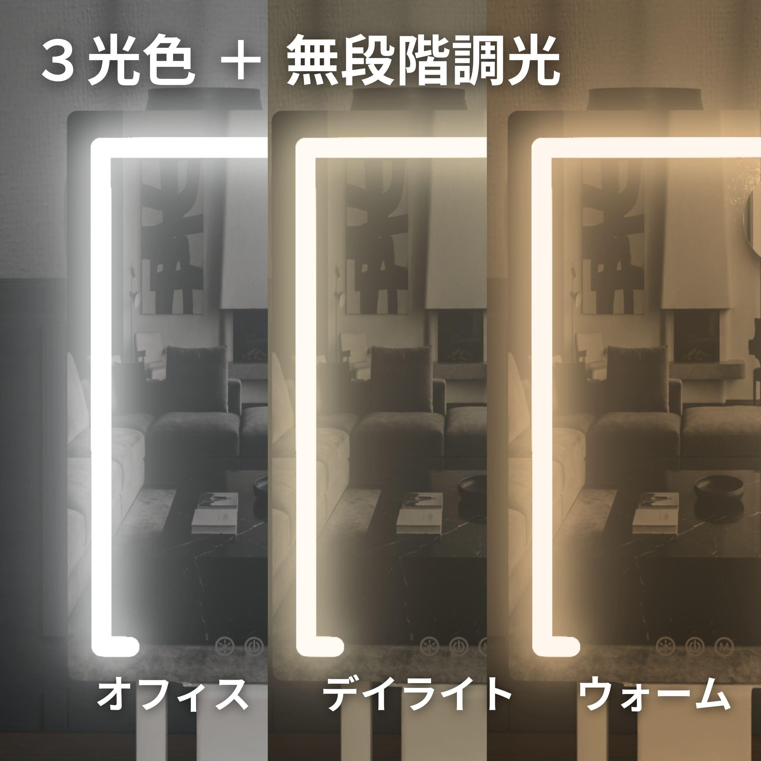 【明るさ抜群】高輝度LEDライトを配置し、暗い部屋でもお顔を明るく照らすことが可能です。ミラー面のタッチパネルで、光色の切り替え(昼光食/昼白色/電球色)、明るさの無段階調整が可能です。