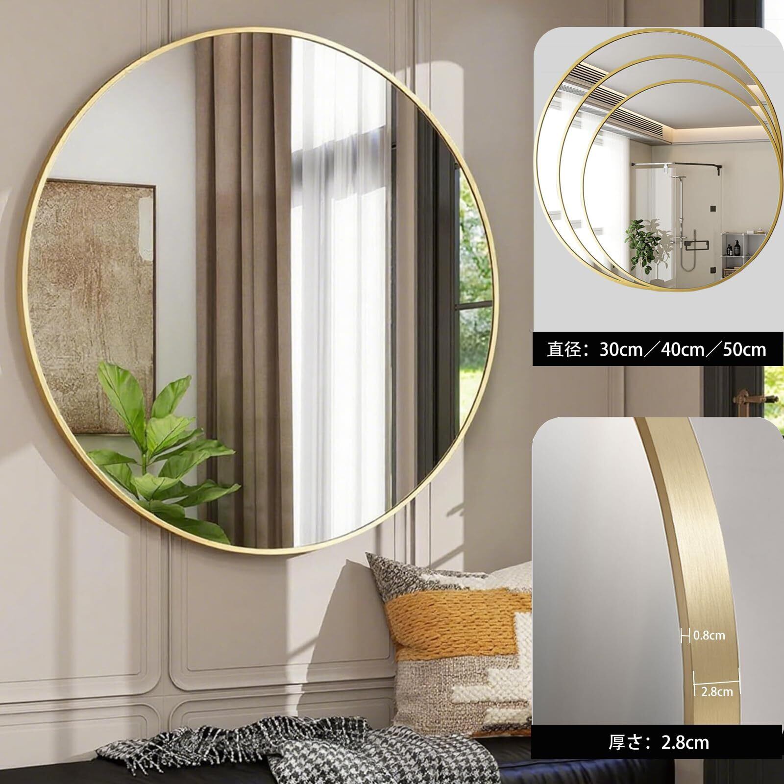 【製品仕様】アルミ壁掛けラウンドミラーサイズ:直径:30cm、フレーム厚さ:28mm、ミラー重量:0.92KG、4色から選択:ブラック、ゴールド、ローズゴールド、ホワイト