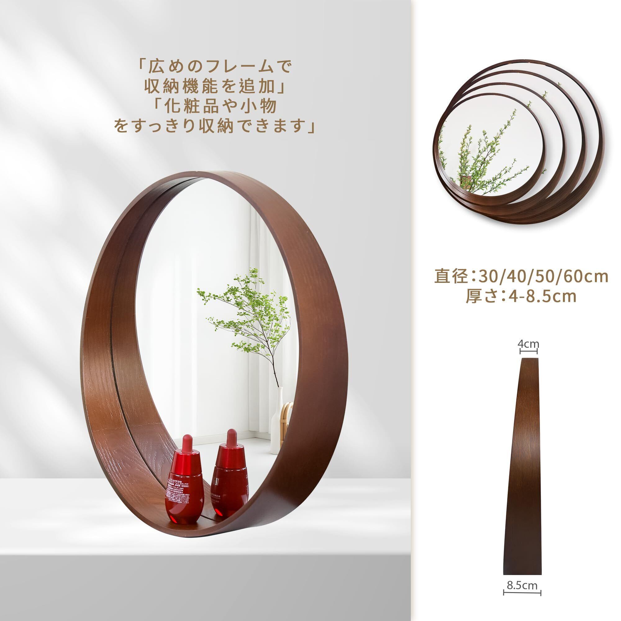 丸型 壁掛けミラー 直径60cm ウォールミラー おしゃれ 北欧 モダン 和風 玄関 寝室 化粧鏡 収納 シンプル ナチュラル 手入れ簡単 軽量 安全 (ブラウン, 60cm)