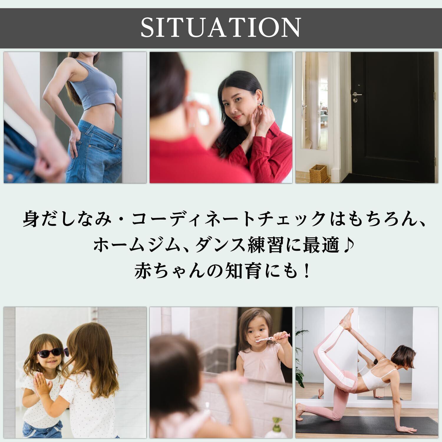 【皆様のお悩み解決】クローゼットのドアに貼りたい、落下して飛散するのが怖い、賃貸住宅に壁掛け鏡を設置したいけどできない、などお悩みと不安を解決する鏡です。※防水、曇り止め加工をしていないため浴室で使用はできません。
