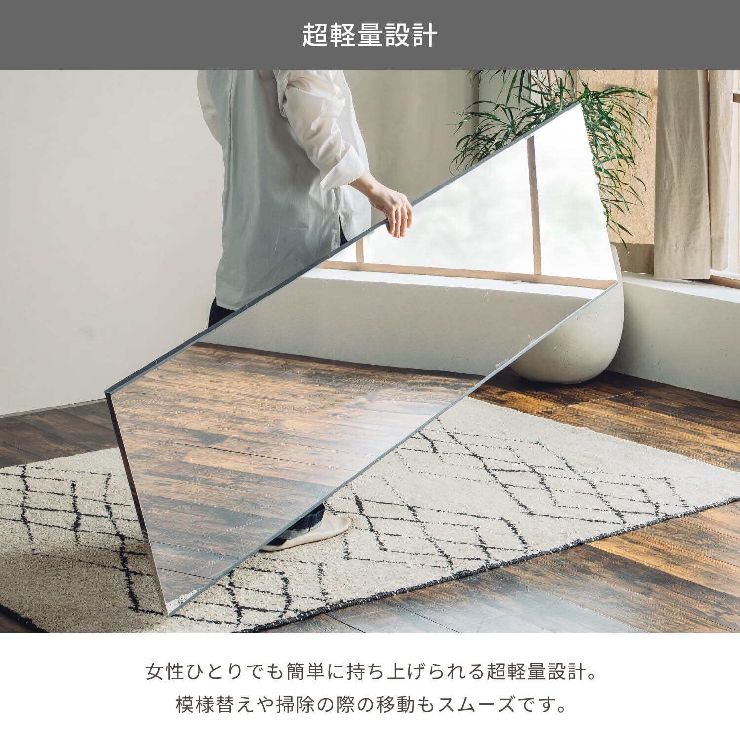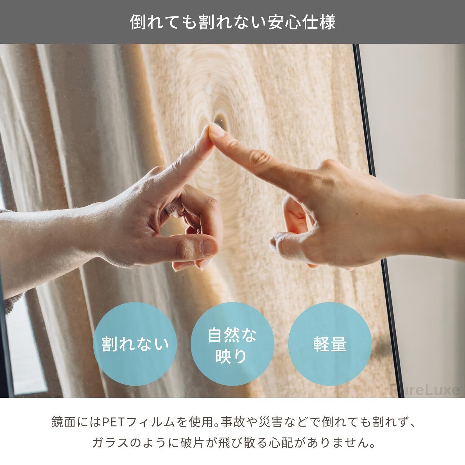 ガラス不使用でお子様やペット、高齢者のいる空間でも安心な割れない全身鏡。軽量&薄型設計で移動や設置も簡単。透明度の高い美しい映りで、日常のコーデチェックやヨガにも最適。選べる4色フレームと7サイズ、床傷防止クッション・壁掛け紐・クリーナークロス付きで快適に使えます。