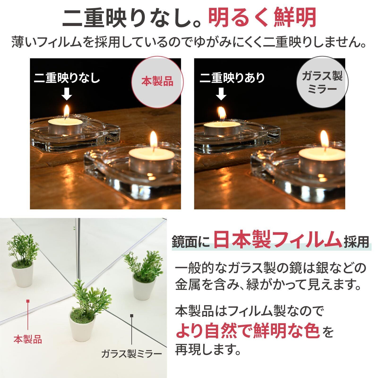 【割れない鏡】ガラスを使っておらず、ミラー面がフィルムなので倒れた際などに割れる心配のない鏡です。ペットや小さなお子さまのいるご家庭にも安心です。日本製の鏡面フィルムを採用。