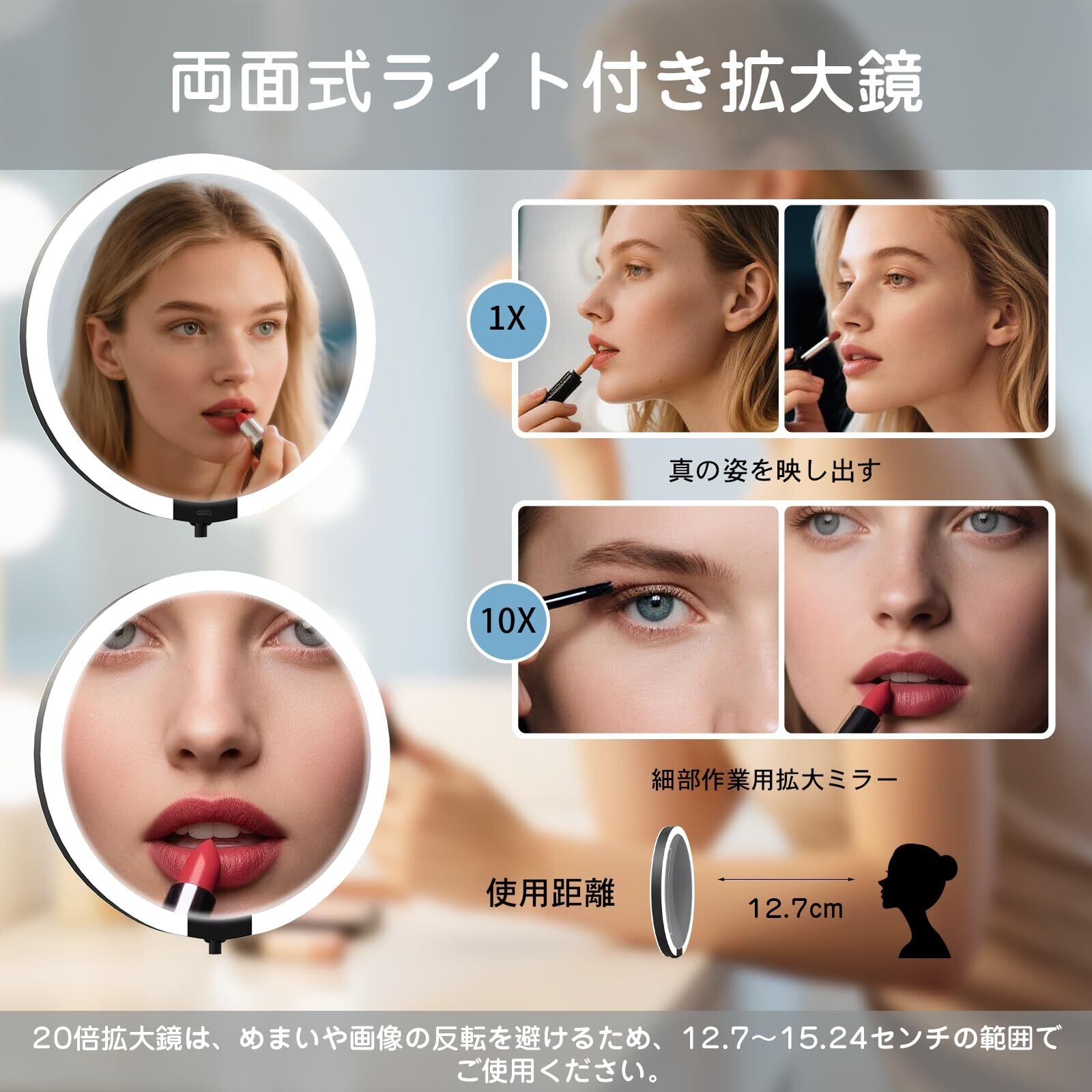 ライト付きミラー 鏡 卓上 拡大鏡 等倍/10倍両面化粧鏡 メイク 女優ミラー 折立鏡 卓上ミラー 折りたたみ式 持ち歩きやすい 3つの光モード LEDライト付き 360°角度調節可能 明るさ無段階調整 化粧品収納可能 充電式バッテリー (ブラック 1X&10X)