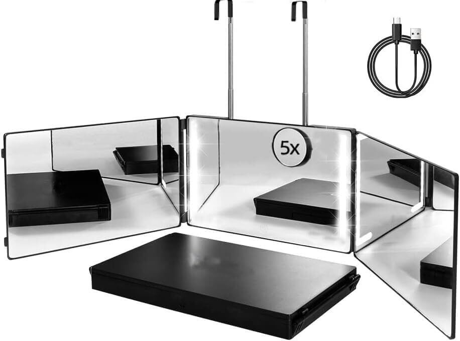 【最新 充電式三面鏡】ARREBOL 三面鏡 壁掛け セルフカット LEDライト 明るさ無段階調整 5倍拡大鏡付き 3ウェイ 後頭部が見える HD鏡面 かがみ 大きい USB充電 28LED 折り畳み 化粧 タッチパネル メイク 高さ調節可