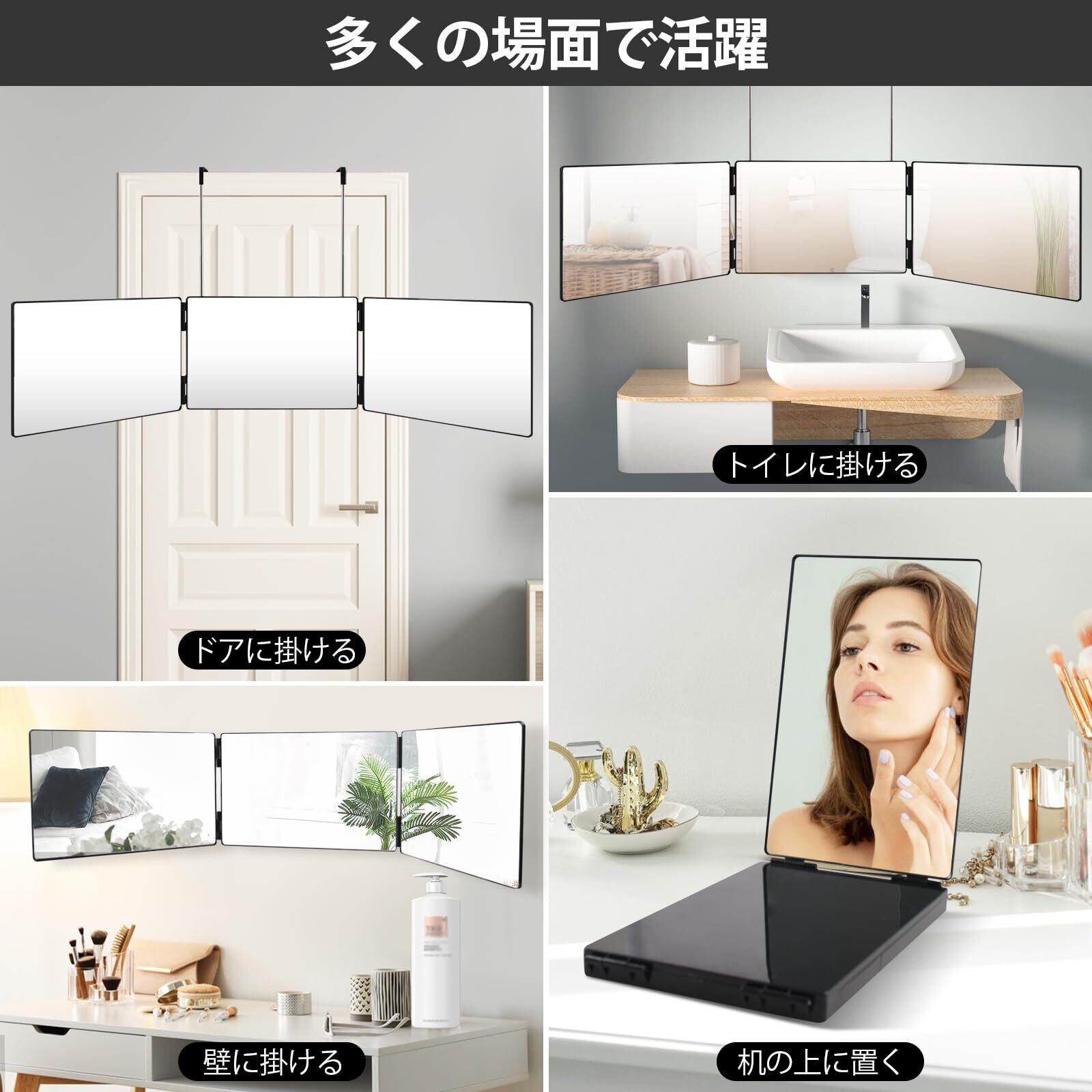 【高精細ガラス】三面鏡は高品質のHDミラーを採用し、シャープな視認性を確保しています。外観は平らで滑らかなABS素材で保護されており、沖突を防ぐことができます。全体的に質感が良く、縁が厚く堅牢なので倒れにくいです。