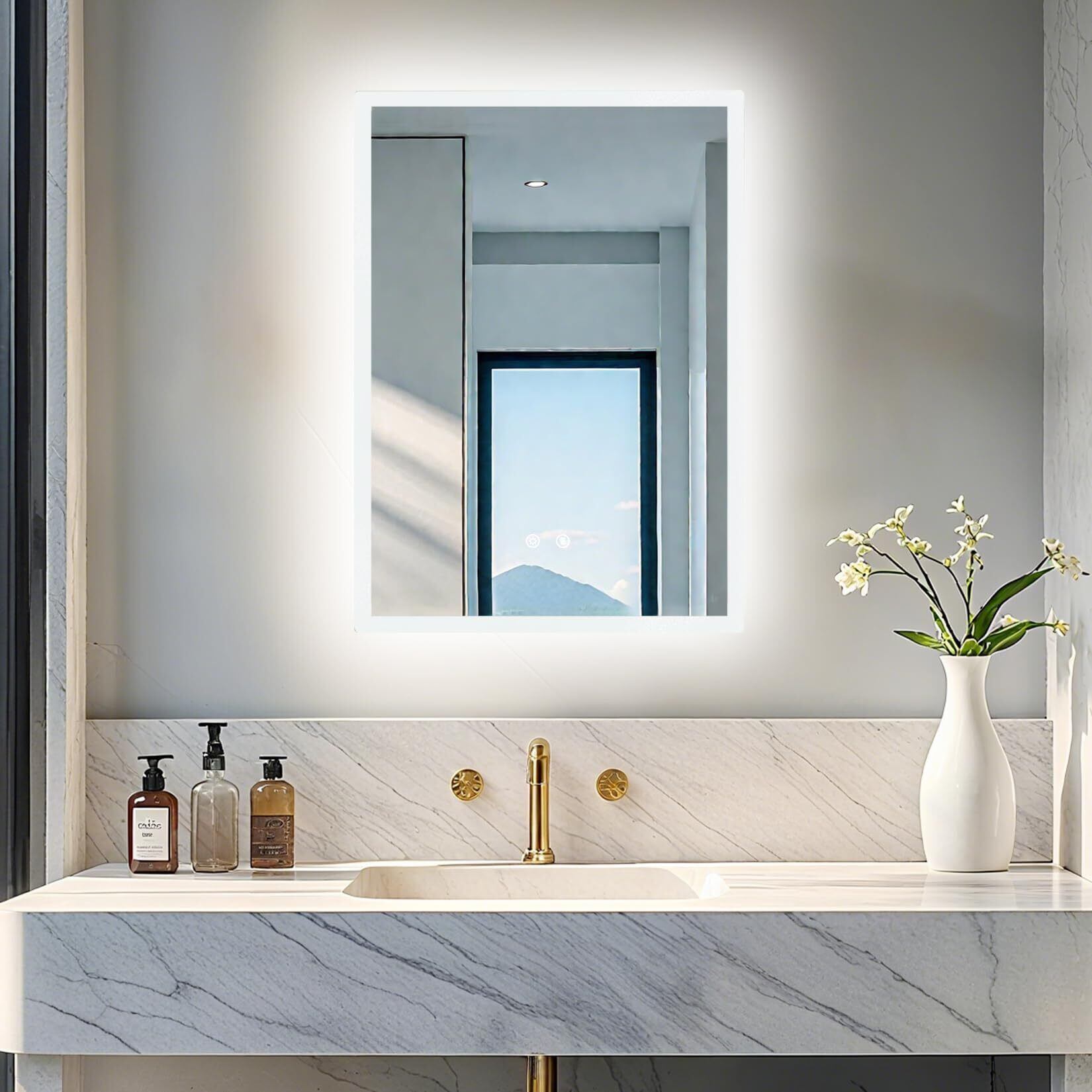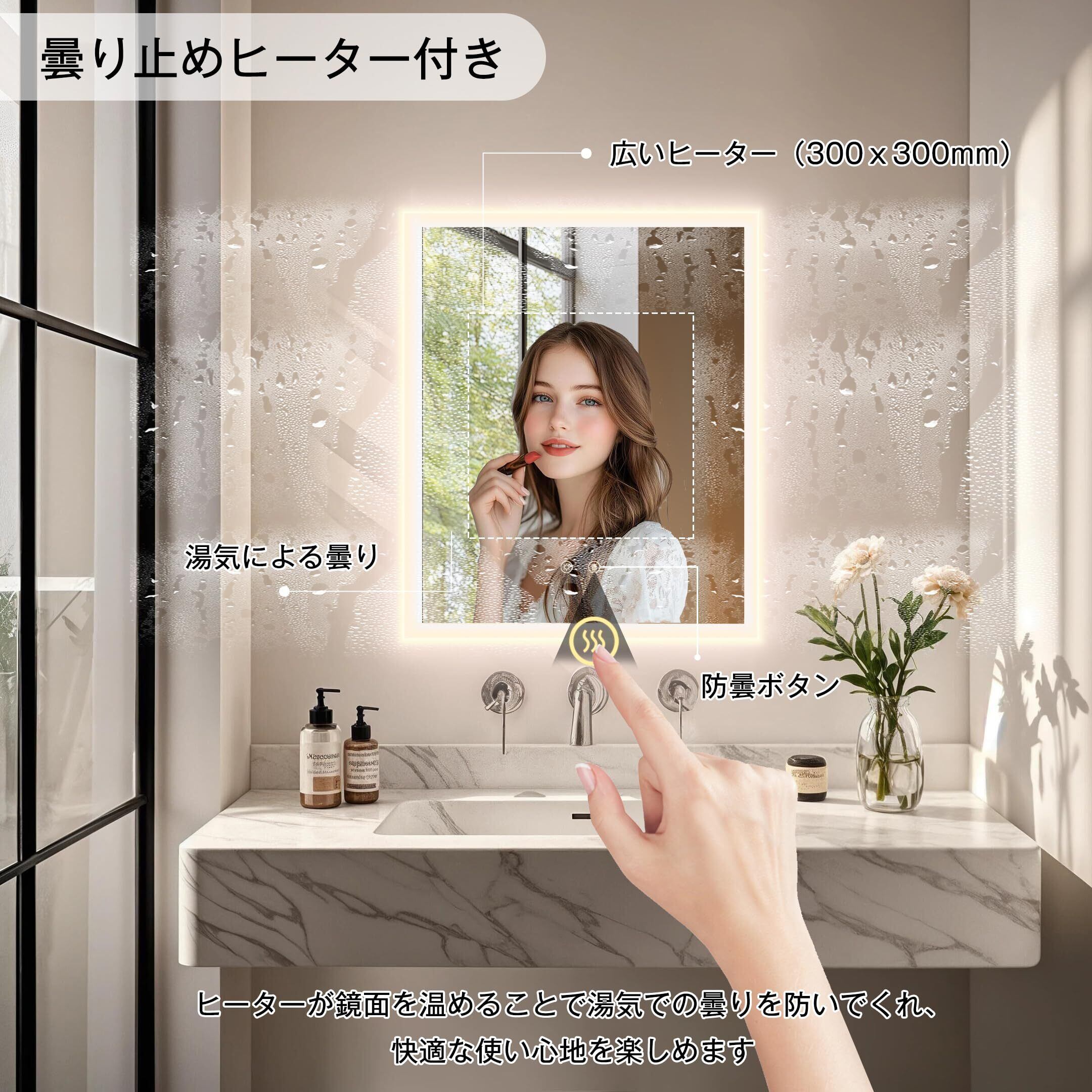 【冬場でも便利に使える曇らない鏡】広いヒーター付きの洗面鏡で、鏡面にある防曇ボタンをタップし、鏡を温めることで蒸気による鏡の曇りを防いだり解消したりできるため、冬に使用するのにとても便利です