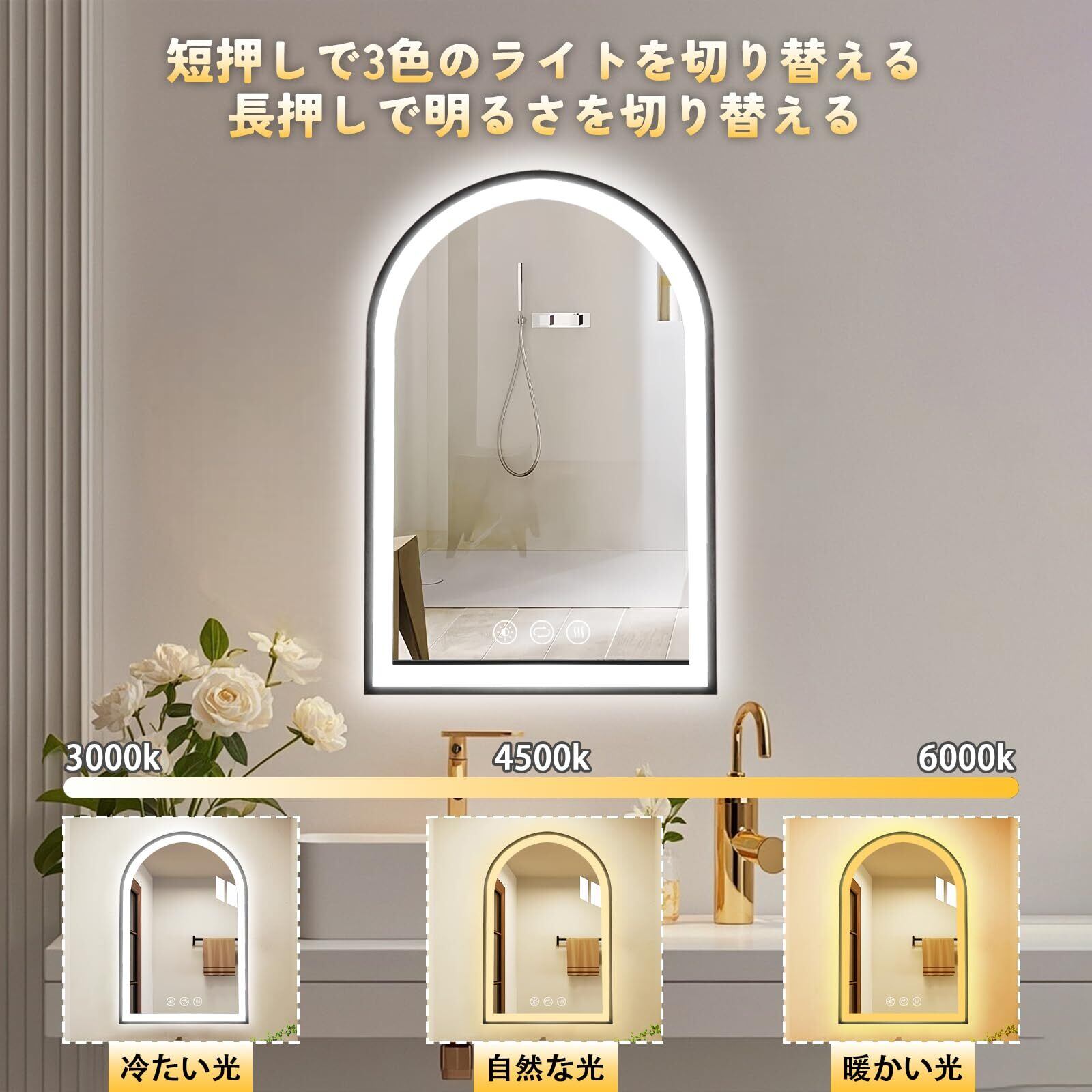 【3色調光&明るさ調節】:この照明付き浴室鏡は、3段階の調色機能を搭載されています。LED照明は、冷白色、自然色、暖白色の3つの異なる色温度の照明オプションに切り替えることができ、付属の調光機能により、個人の好みや環境に応じて鏡の明るさを調整可能です。これにより、最良の照明効果を確保できます。