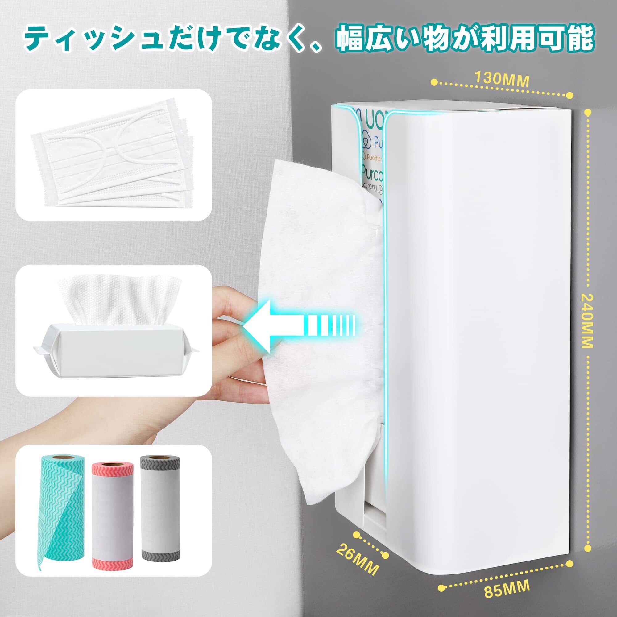 3.幅広い物も利用可能:ティッシュだけでなく、クレンジングタオル、マスク、ラップフィルム、使い捨てふきん、マスク、ポリ袋などを収納できる