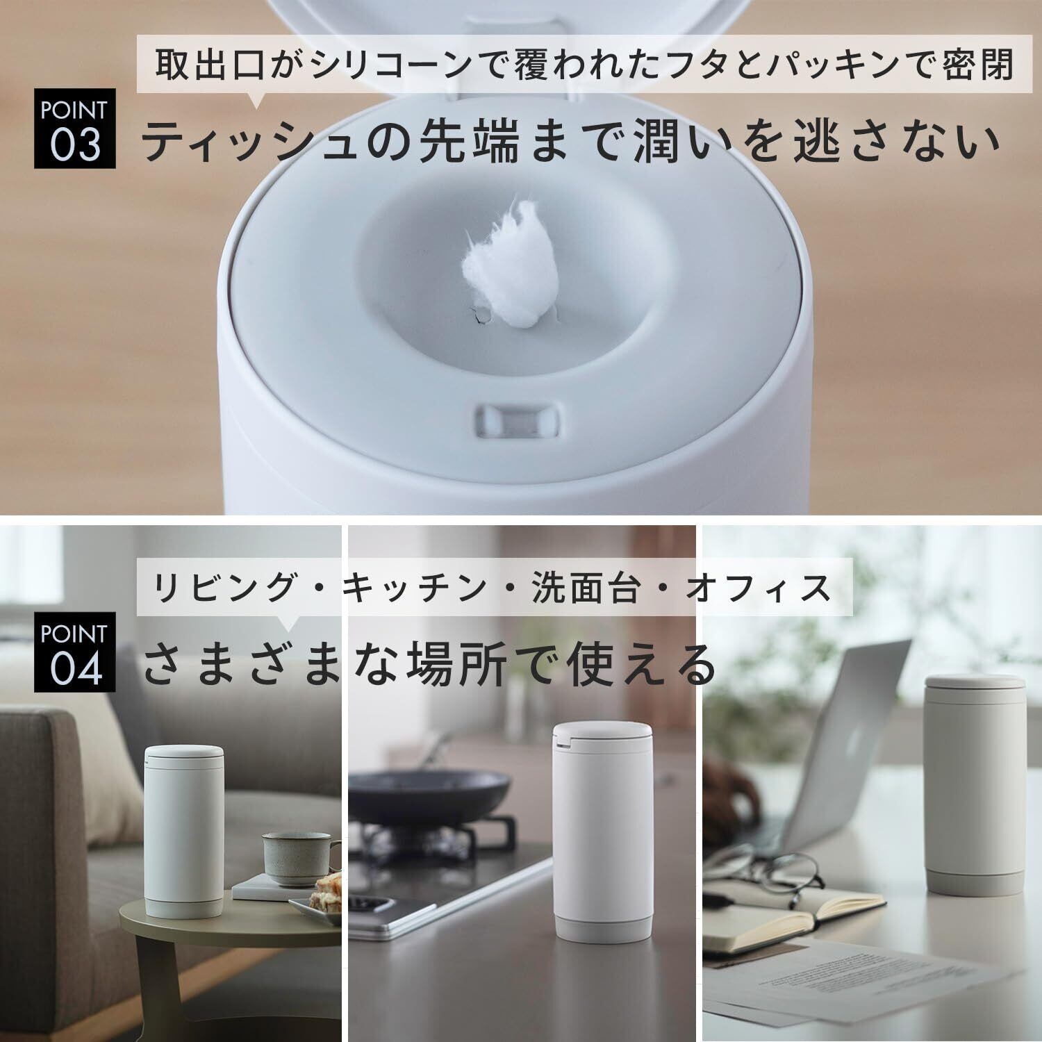 【さまざまな場所で使える】リビング、キッチン、洗面台、玄関など家じゅうさまざまな所で便利に使えます。また、オフィスに置いても仕事中にサッと引き出してすぐに使えます。