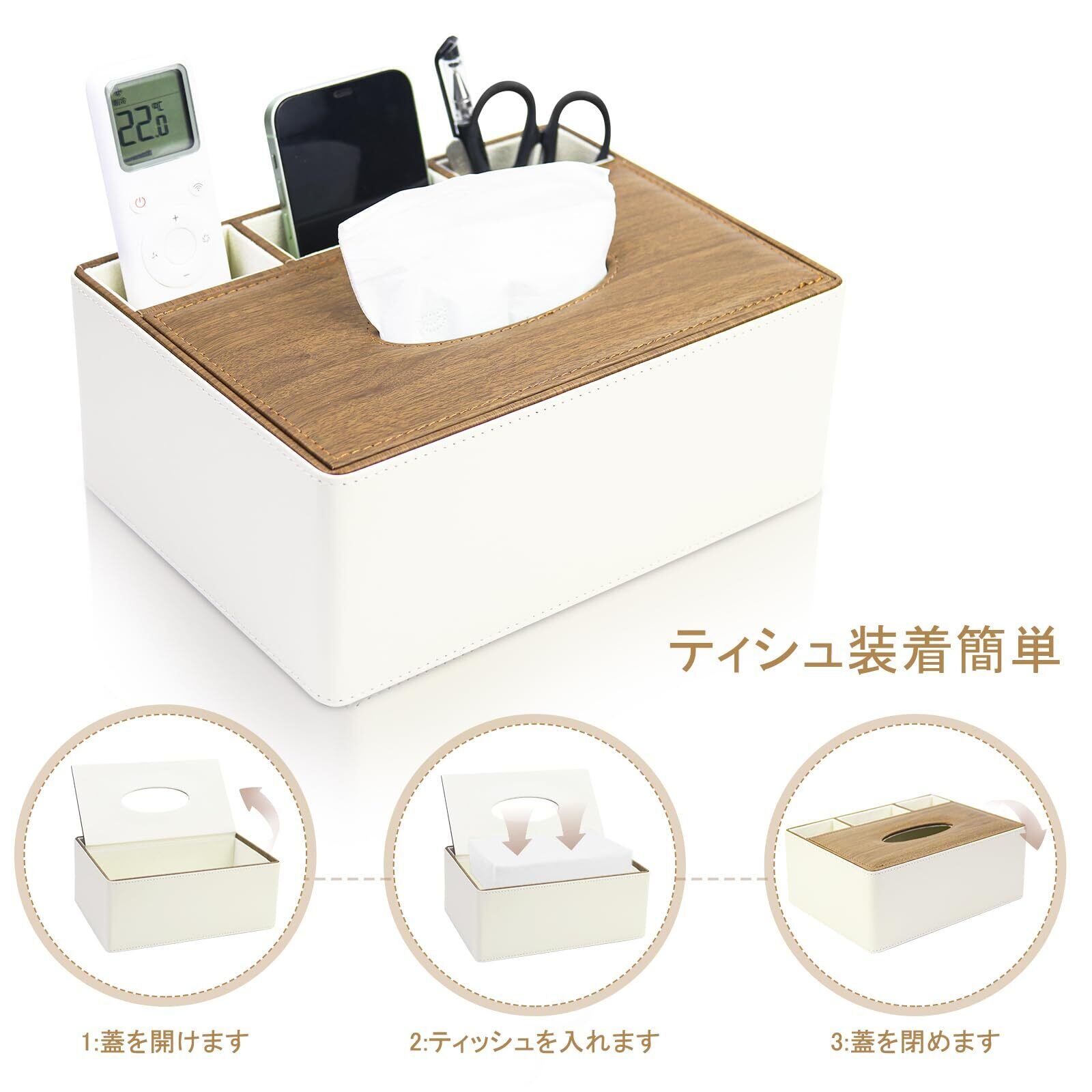 【卓上収納】ティッシュ、リモコン、ペン、ハサミなど、机の上のこまごまとした小物を整理できる卓上収納ボックスです。家庭用だけではなく、オフィス用、レストラン用、ホテル用にも適しています。ティッシュボックスは上蓋を開けて、簡単にティッシュペーパーをセットできます。入れ替えにも気軽に行えます。取り出し口が広くティッシュをさっと取り出せます。