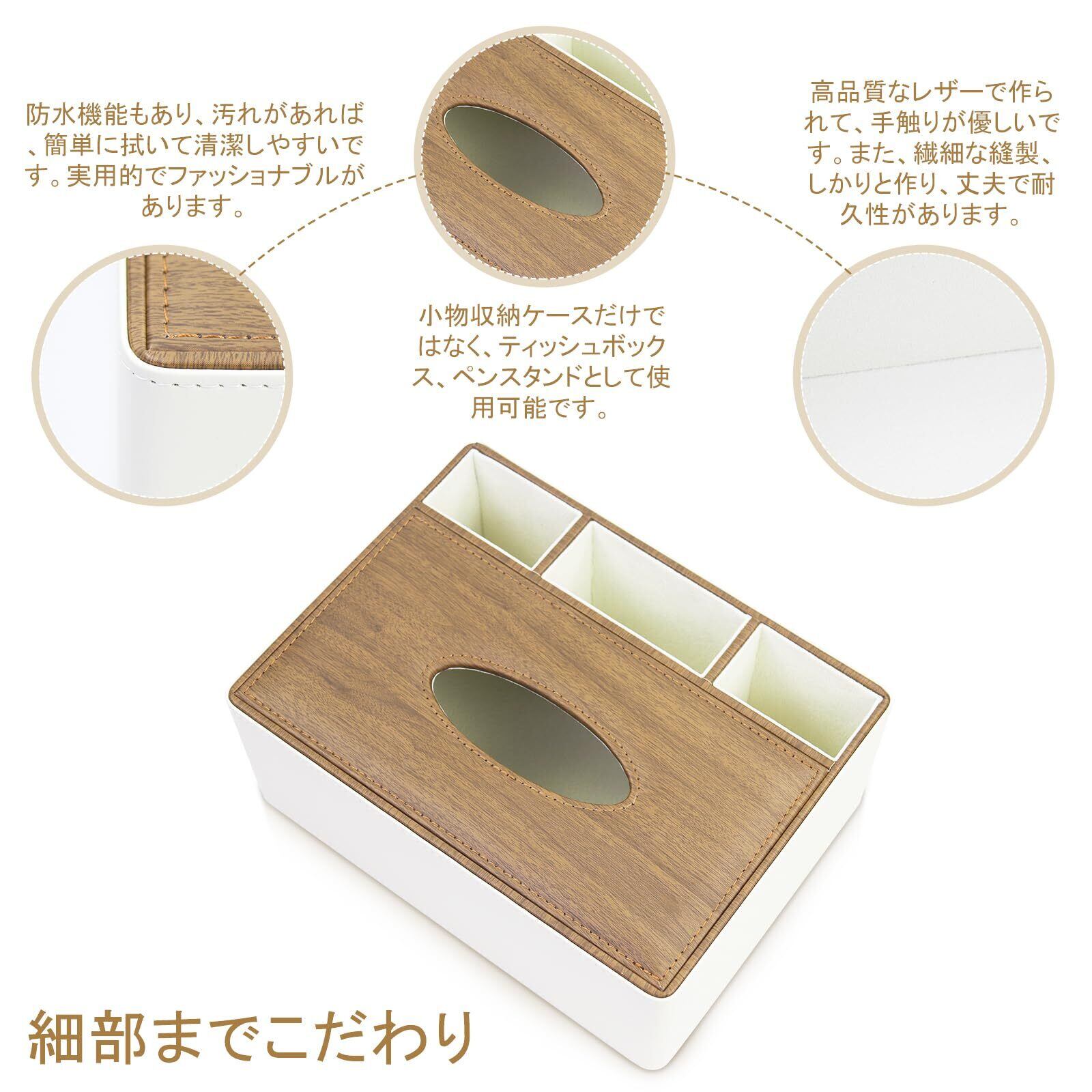 ティッシュケース PUレザー製 多機能収納ケース ティッシュボックス・ホルダー ペン・鉛筆・リモコン収納 卓上収納 仕切り付き 小物収納 オフィス用 家庭用 (ベージュ+淡い木目調)