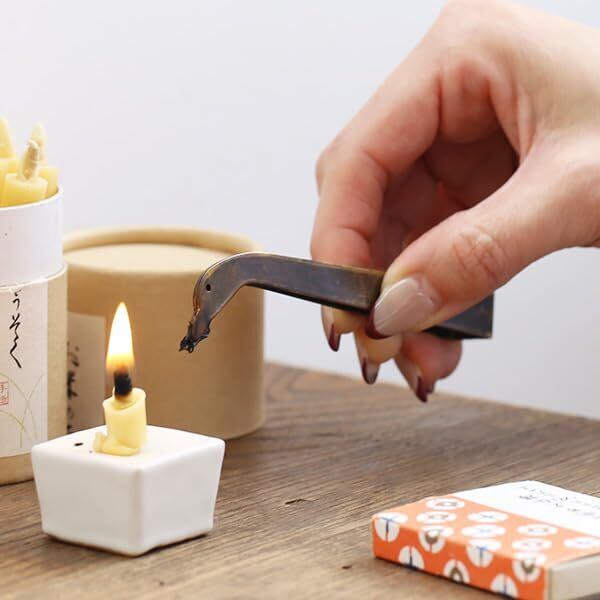 石川県七尾市にある和ろうそくの老舗店、高澤ろうそくと、鋳物の町、富山県高岡市にある能作が作った、アヒルの芯切りばさみ。先端がアヒルの形になっており、とてもかわいらしい芯切りばさみです。 大きさはピンセットくらいで、つまむ動作や感覚が直感でわかるのがよいところ。先端のくちばし部分で燃え残った芯をついばむように取り除けます。 火を取り扱うため、芯切りばさみは仏具によく使われている真鍮製。使い続けると持ち手や角部分から真鍮の下地が見えてくるようになり、使い込まれていく姿に愛着が湧いてきます。 安全に火の調節することができる芯切りばさみは、和ろうそくを灯すときに揃えておきたい道具です。