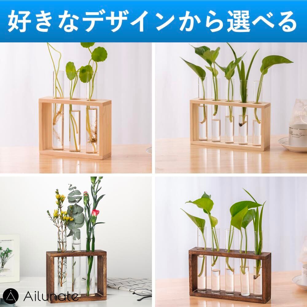 Ailunate 花瓶 ガラス 試験管 フラワーベース 花瓶台 木製フレーム 一輪挿し 卓上 壁掛け スタンド 水耕栽培 花 おしゃれ (ブラウン, 試験管5本)