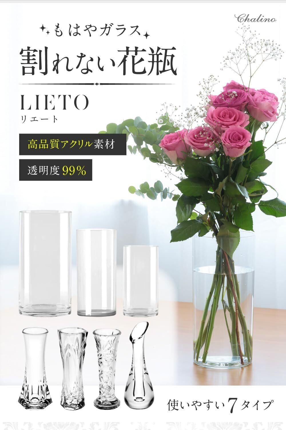 落としても割れない、安心のアクリル製花瓶。見た目はガラスのように透明感がありながらも、軽くて丈夫な素材でできているため、お子さまや高齢者がいるご家庭にも安心してお使いいただけます。