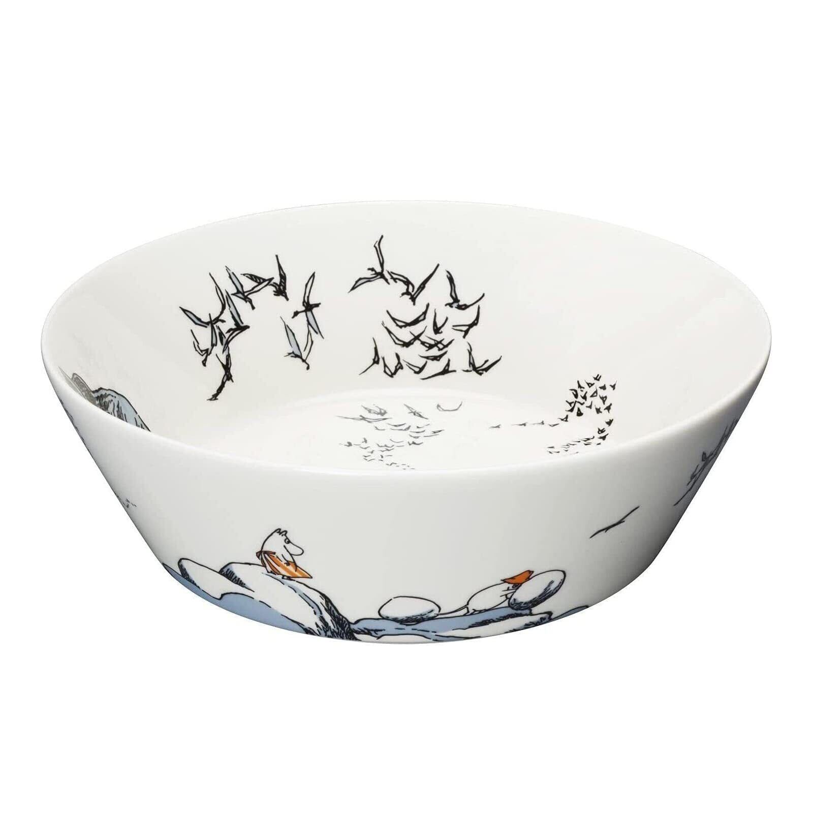 サービングボウルには、ホームシックのムーミンママが、輝く海を見て徐々に元気を取り戻す場面が描かれました。空を飛んでいく鳥の大群が人生は続いていくことを暗示しているかのようです。