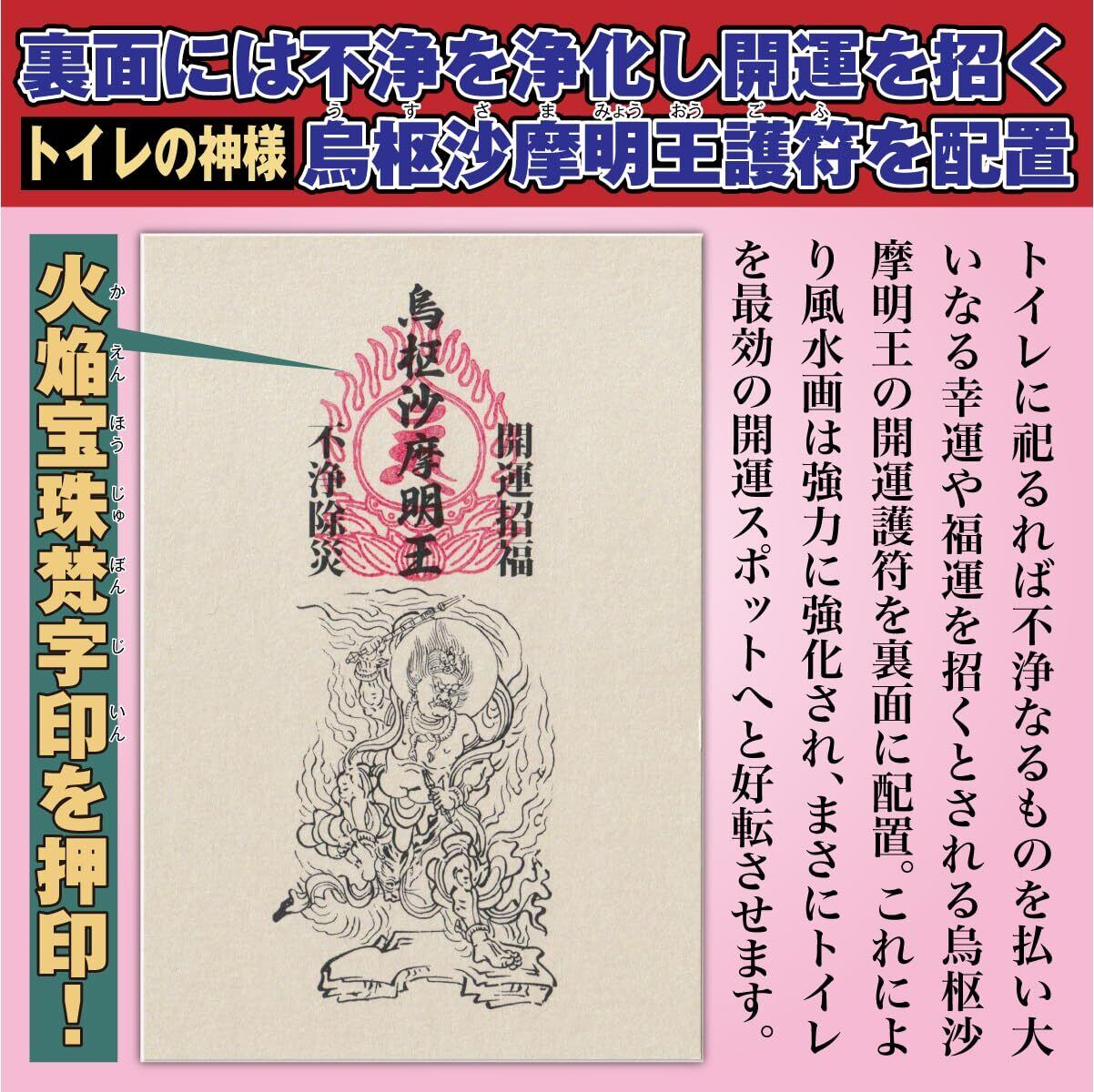 風水画の裏面には、トイレの神様として有名な烏枢沙摩明王(うすさまみょうおう)の御影が描かれた開運護符が配置され、さらに烏枢沙摩明王の梵字を配した「火焔宝珠梵字護符(かえんほうじゅぼんじごふ)」を押印。これにより、風水画はさらに強力に強化され、まさにトイレを最効の開運パワースポットに好転させるのです。
