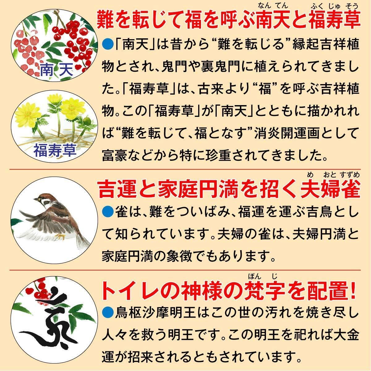 この『開運厄除・消災南天福寿』は、まさに話題のトイレ風水絵画です。この絵を貴家のトイレに飾れば、トイレの凶相からやって来る厄難や災害がはね除けられ、幸運や吉運が次々と招き寄せられ、大金運を貴家に生み出してくれるのです。その効果の大きさは圧倒的です。