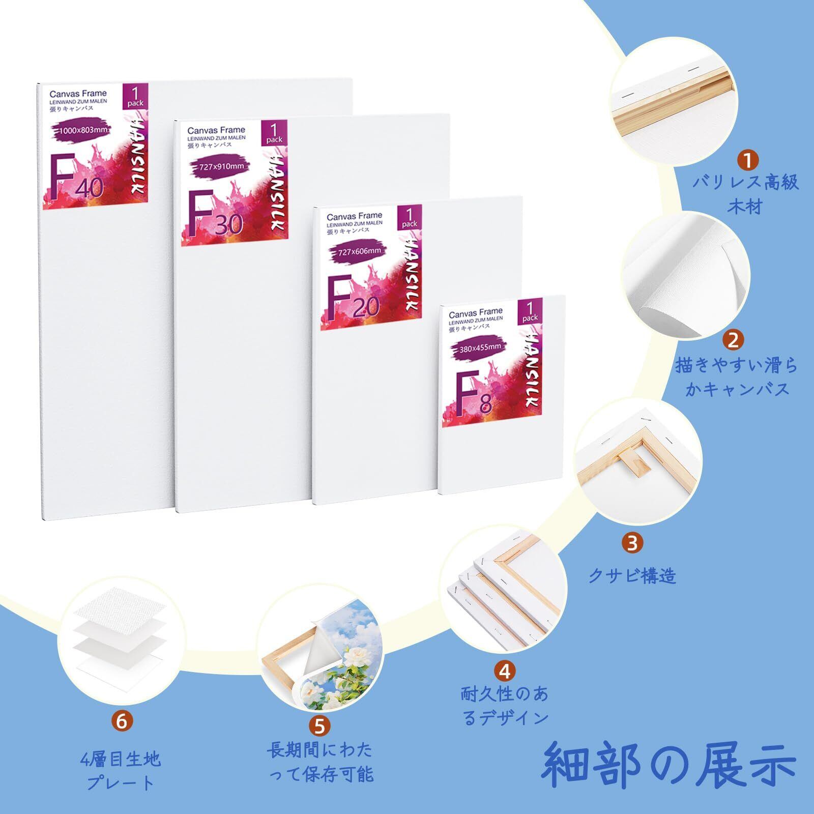 【丈夫&変形しにくい】:ホッチキスでキャンバス生地をとじていた、榫卯構造ので、絵具の固着性にも優れています。画布をしっかりしている。丈夫で変形しにくい。キャンバス生地が動きにくく、直接にイーゼルに載せれば、早速に絵画できます。