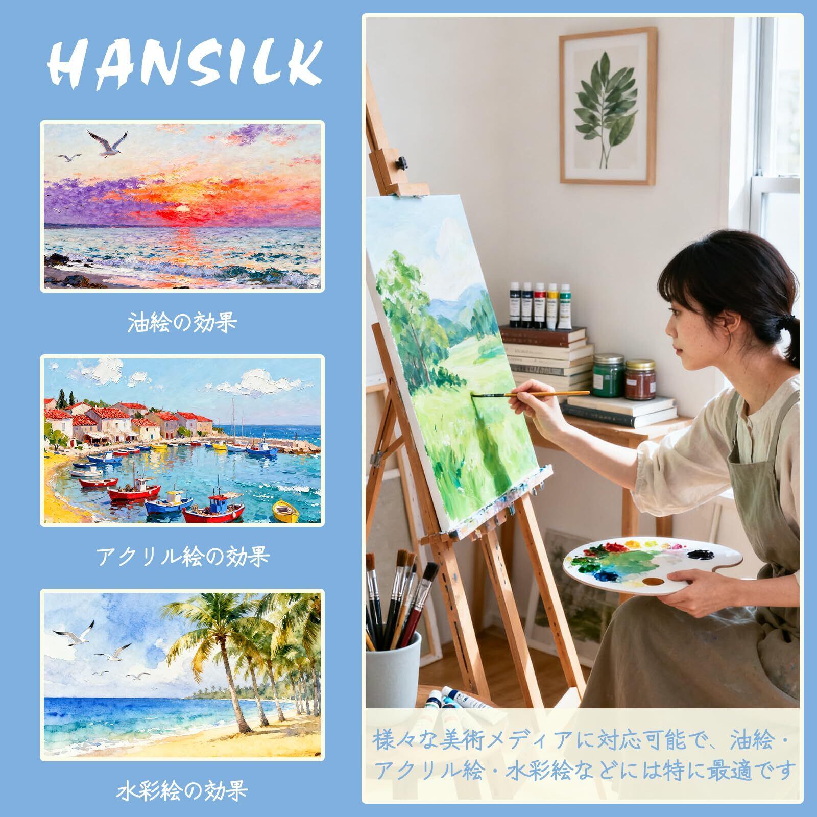 【描きやすい】:画布は綿化繊混紡の高品質素材を使って、中目のキャンバスです。麻に比べキャンバスの目が均一できれいです。色乗りがよく、描きやすいです。さまざまな絵具に対する吸収性にすぐれ、塗料が漏れにくいです。半吸収性の特性で、油絵だけでなく、アクリル絵の具にも使用できます。