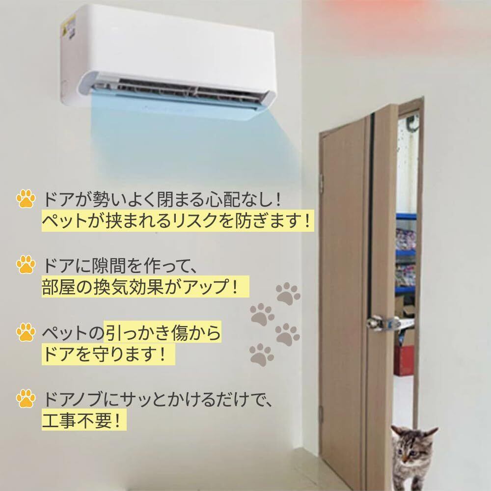 ドアのハンドルに引っ掛けてピンを差し込むだけで、ドアに安全な隙間を確保できます。ペットが挟まれる心配を防ぎ、空気の流れを遮断しません。