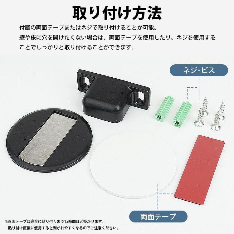 prendre マグネット式 ドアストッパー フラット 薄型 戸当り 強力 磁石 金属製 室内 ドア用 扉 DIY 金具 キャッチ ドア固定 ドア止め 両面テープ 固定ネジ付属 (シルバー) PR-MAGSTO-SV