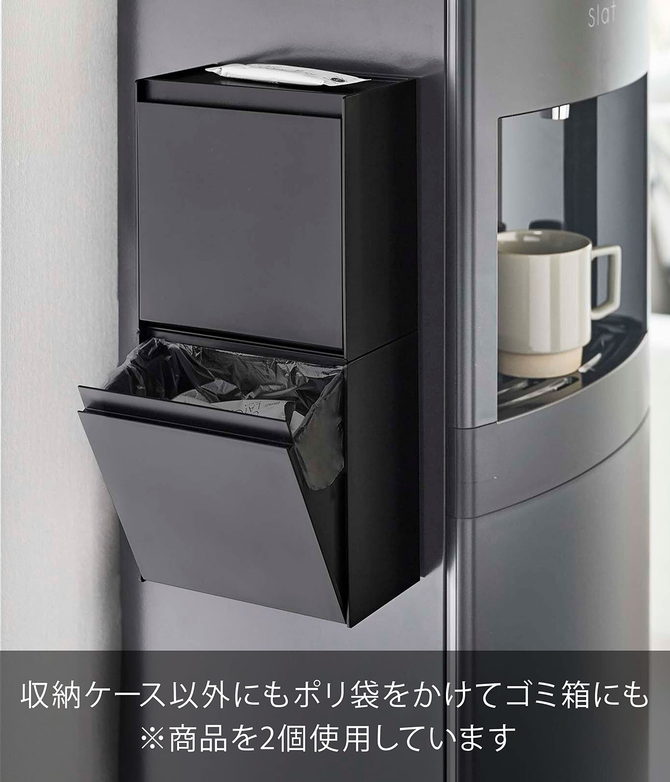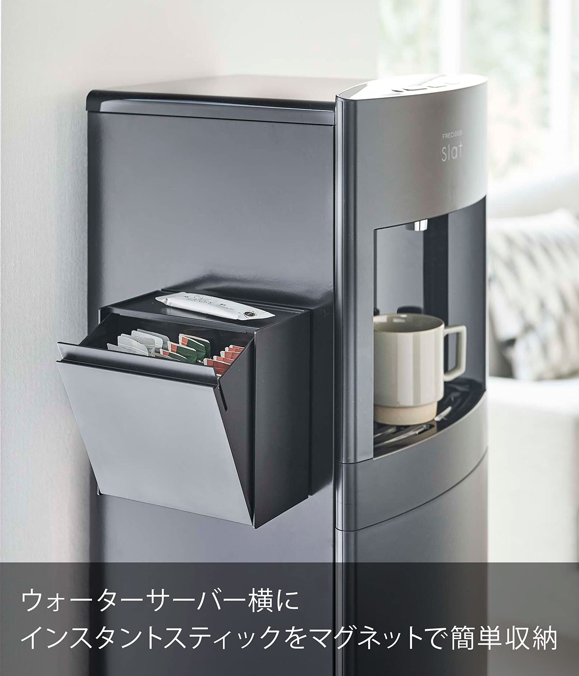 マグネットでウォーターサーバーや冷蔵庫に付けても、置いても使えるインスタントスティック収納ホルダー! ポリ袋を引っ掛けてゴミ箱としても使用できます。商品を2個使用時は縦に並べて上は収納、下はポリ袋を掛けてゴミ箱といった使い方が可能。斜めに開口するフラップ式だから片手でサッと取り出すことができる! インスタントスティックやドリップパックの収納に。天板はトレーになっているから、コップの一時置きにも。薬やサプリメントの収納としても便利。オフィスやテーブルに置いても使用できます。底面にはシリコーンの滑り止め付き。仕切りが2枚付いているから、収納するもののサイズ・味・量に合わせて分別できます。