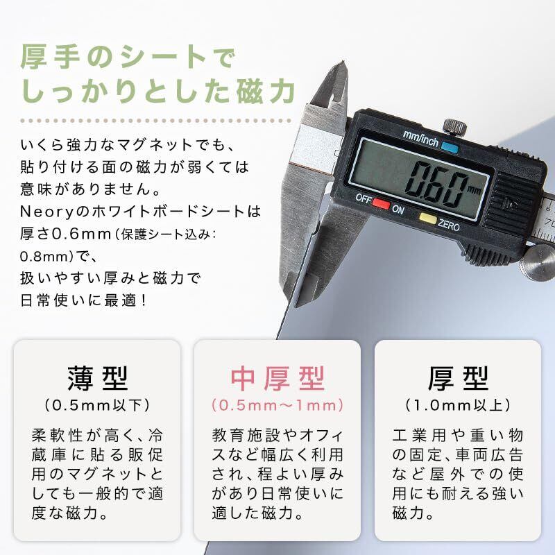 強力マグネットがしっかりくっつく!厚さ0.6mmのホワイトボードシート(保護フィルム含め0.8mm)