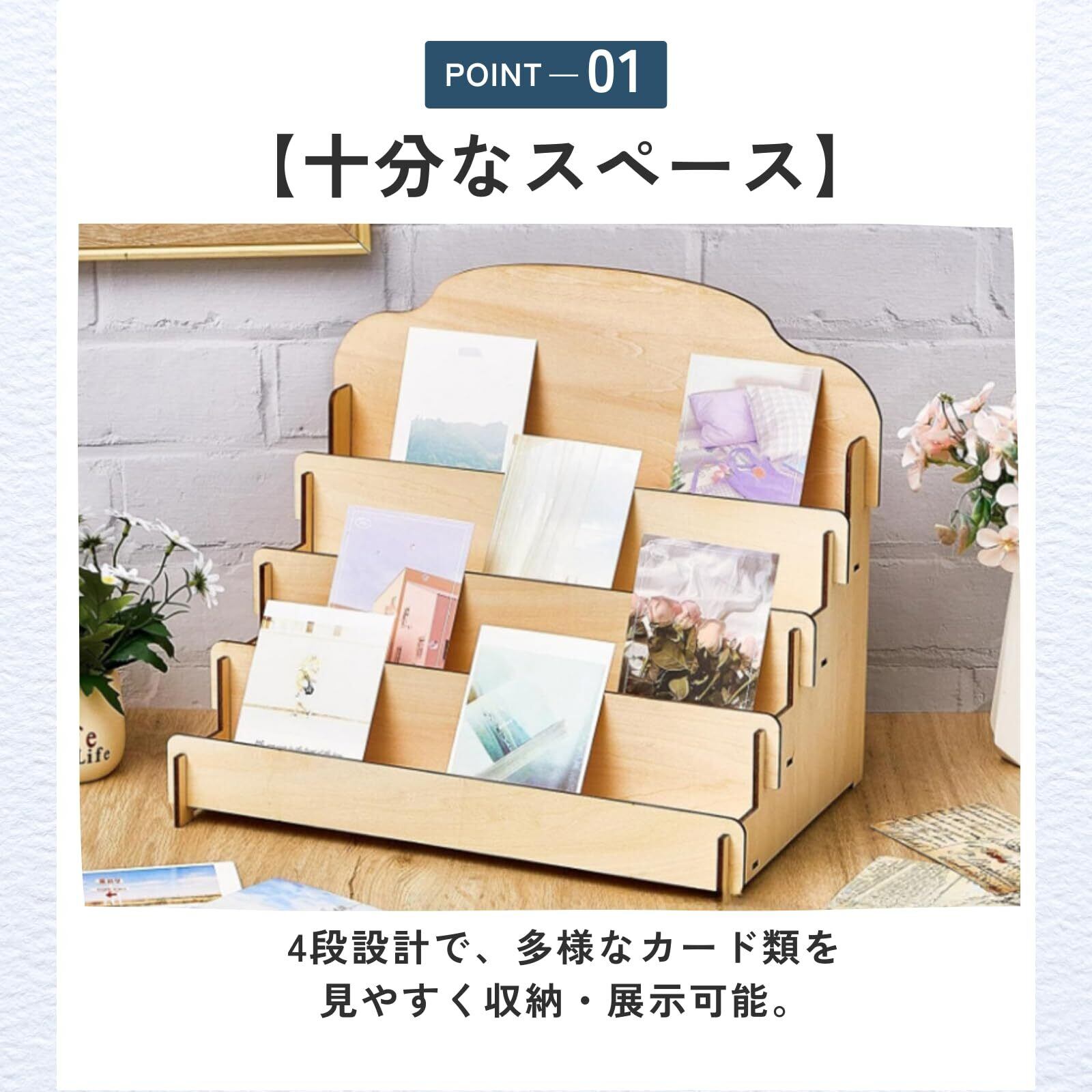 【十分なスペース】4段設計で、多様なカード類を見やすく収納・展示可能。【高い汎用性と多目的活用】店舗から自宅まで、名刺や小物をおしゃれに見せる万能ディスプレイ。【天然木製で頑丈&高耐久】環境に優しい天然木製で、どんな空間にも馴染むナチュラルな風合い。【多用途】キッチンや洗面所、デスク上でも活躍!省スペースで美しく整理整頓。
