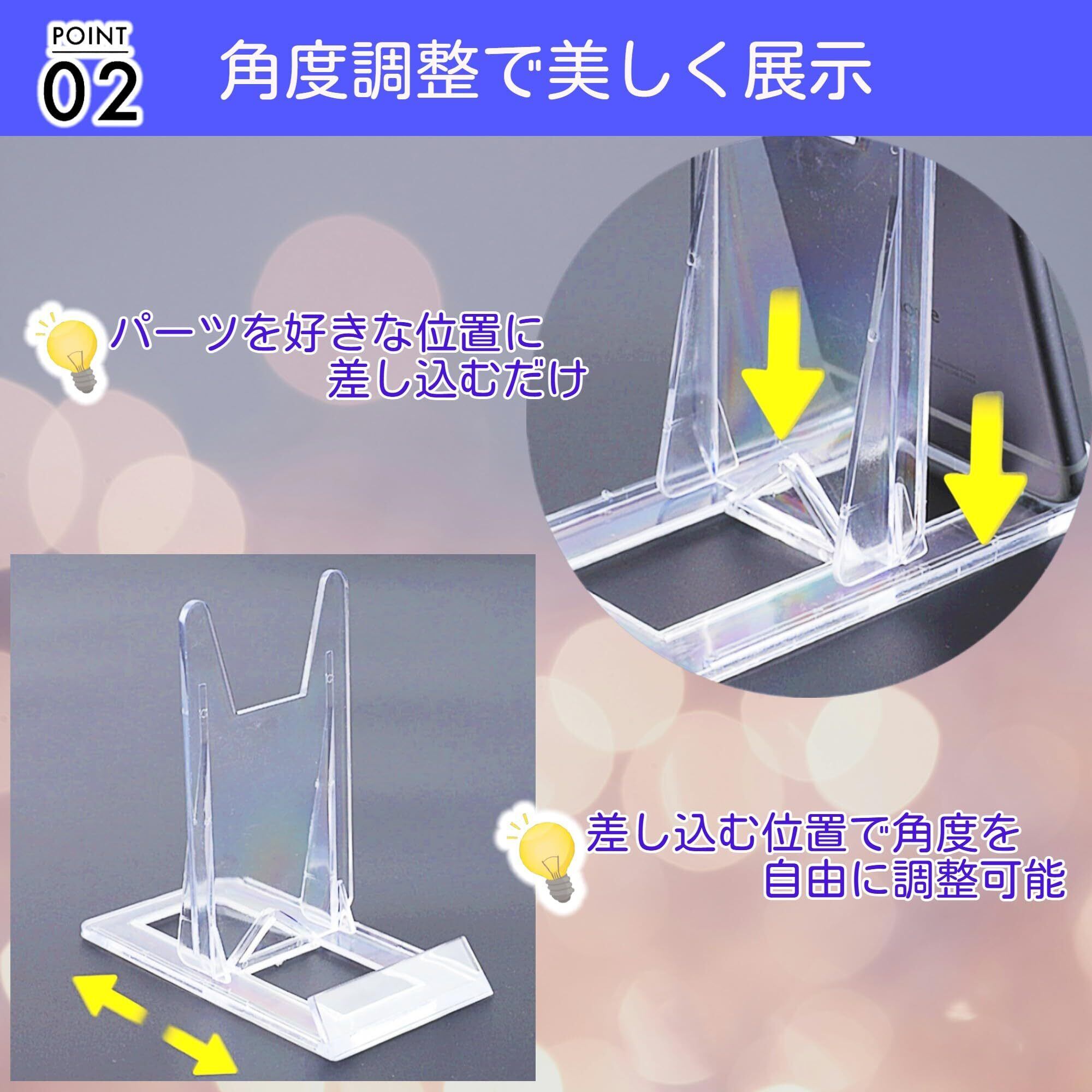 【ディスプレイ角度を自由に調整】スタンドは、アイテムの配置に合わせて角度を細かく調整できる設計です。これにより、展示するアイテムが一番美しく見える位置に置け、後ろに倒れる心配もありません。安定感があり、どんなアイテムでもしっかりと支えてくれます。