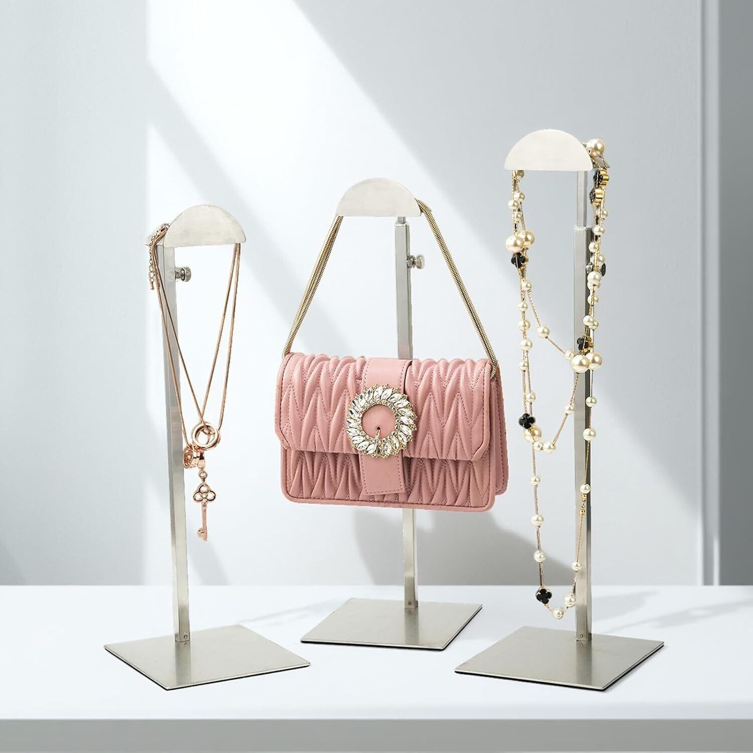 「展示効果」シンプルなデザインが様々な空間のインテリアに溶け込みやすいです。金属光沢がショップのモダンな雰囲気に調和し、フック部分はカバンが落ちにくい幅広設計で、形崩れを防ぎつつ、おしゃれに飾ることができます。