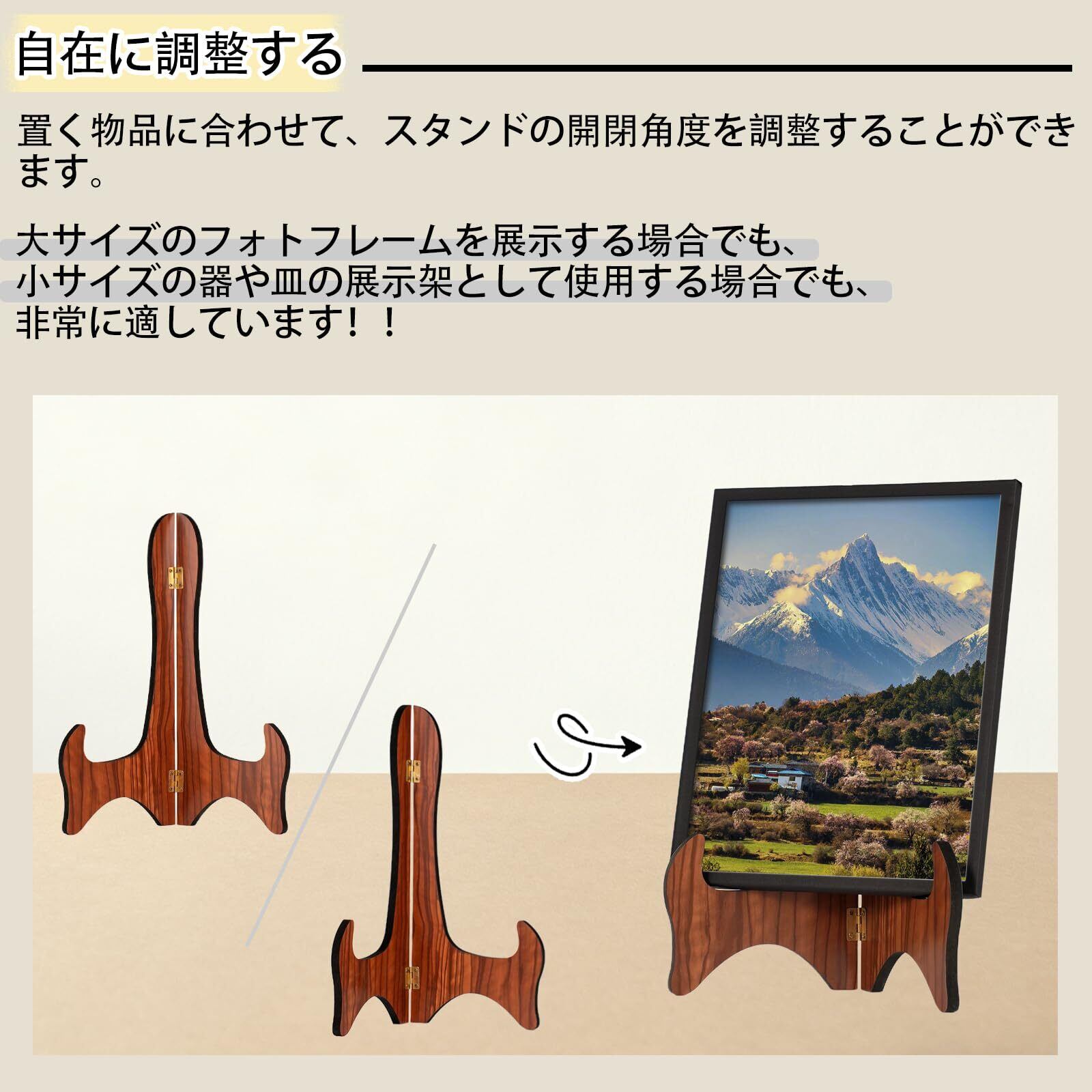 美しい木目柄デザイン、高品質な体験:スタンドは堅牢で耐久性に優れた高品質な素材を使用しており、長くご愛用いただけます。その確かな品質は設置場所を選ばず、木目柄が持つ温かみのある風合いにより、仏壇用の遺影立て、リビングのおしゃれな写真立て、オフィスの賞状立て、あるいはレストランの木製皿立てとしてお皿を美しく展示する場合でも、どんな空間にも自然に調和します。1台のスタンドで多様な用途に対応でき、季節や使用ニーズに合わせて展示するアイテムを容易に変更できます。