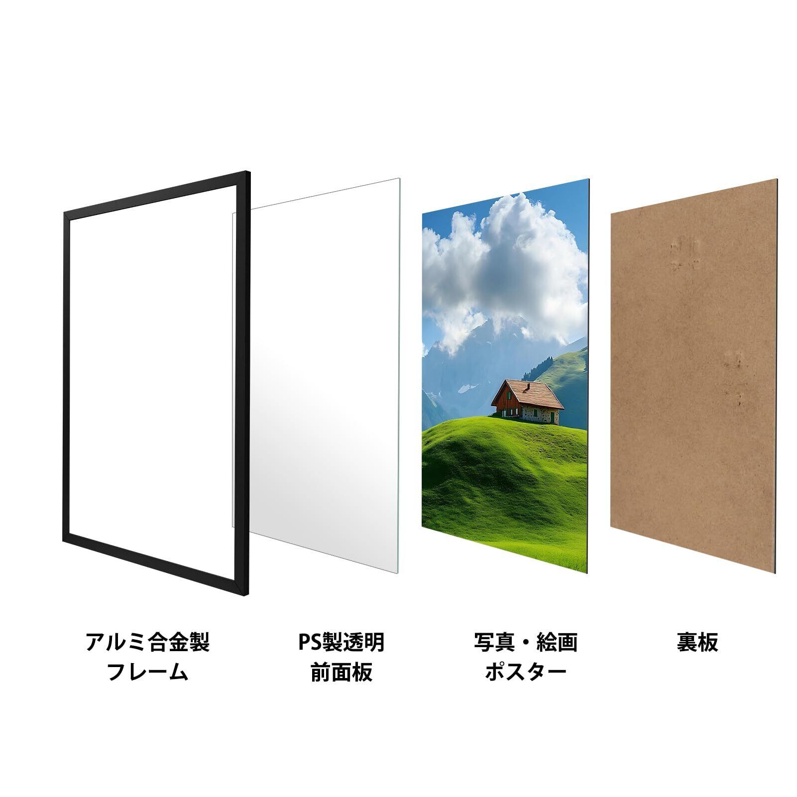 材質:フレームがアルミニウム製 透明面材がPS製を採用。 軽量(1370g)ながらもしっかりとした強度を保ち、作品をしっかり保護します。