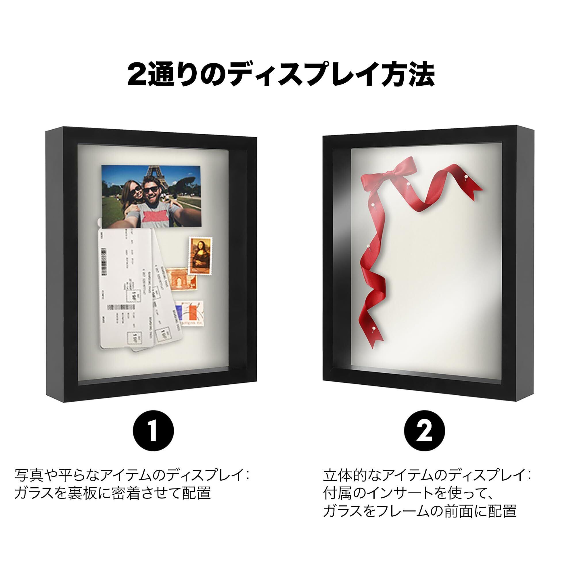 理想的なサイズと耐久性のある素材: この28cm x 36cmシャドーボックスフレームは、モダンな20x60mmモールディングを採用し、耐久性の高い加工木材(MDF)で作られています。ブラック仕上げのデザインが、大切な記念品や思い出の品を美しく引き立てます。