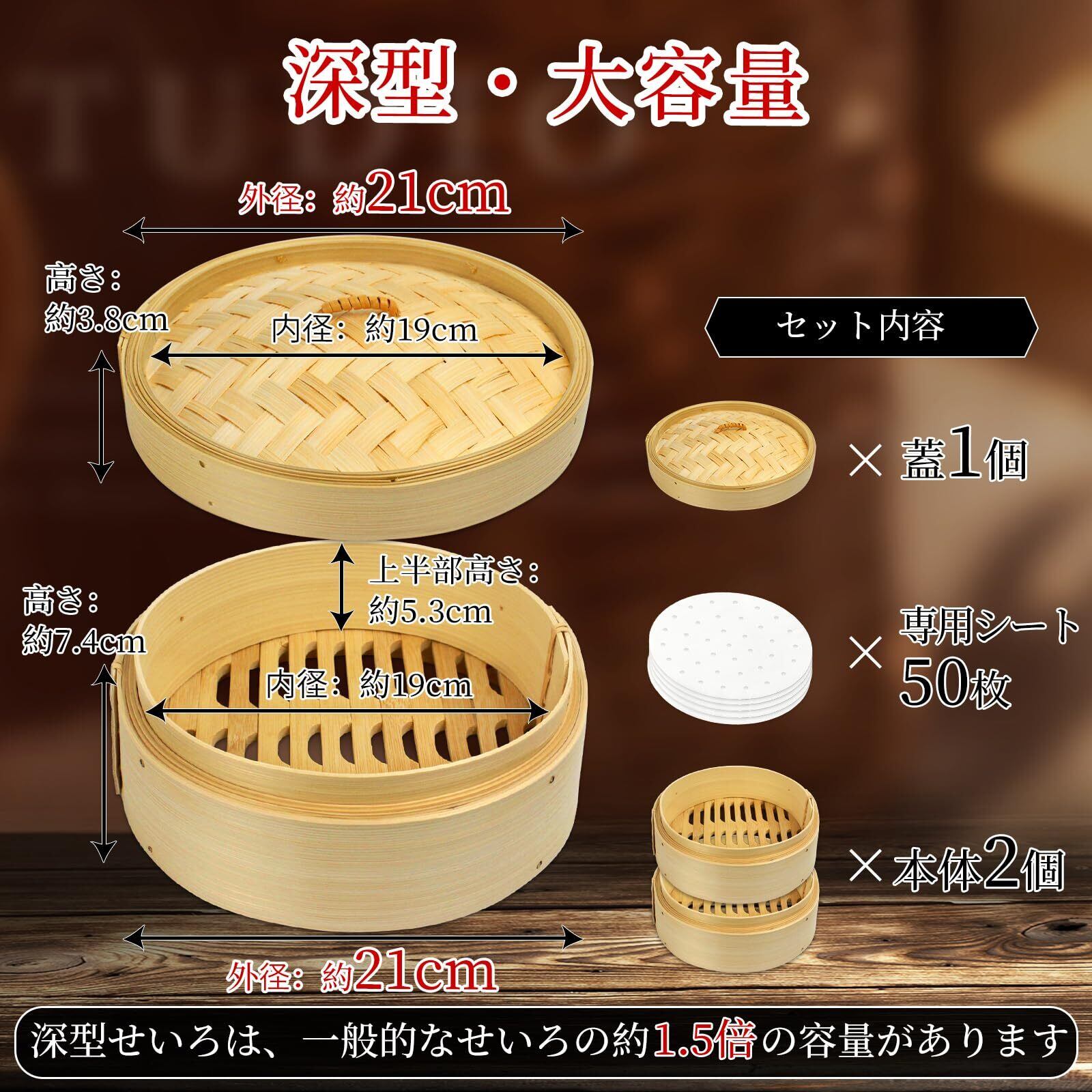 【料理研究家監修】深型 手作り 竹セイロ セイロ専用用紙50枚付 本体2個・蓋1個セット 蒸篭 業務用 せいろ蒸し器 (竹セイロ直径約21cm)