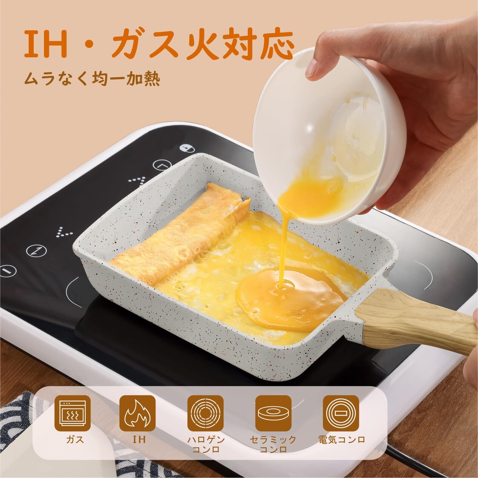 SENSARTE 卵焼き フライパン セラミックコーティング フライ返し付き 18cm*15cm IH対応 ガス火対応 焦げ付かない PFOAフリー 握りやすい お手入れ簡単 軽量 ターナー付き