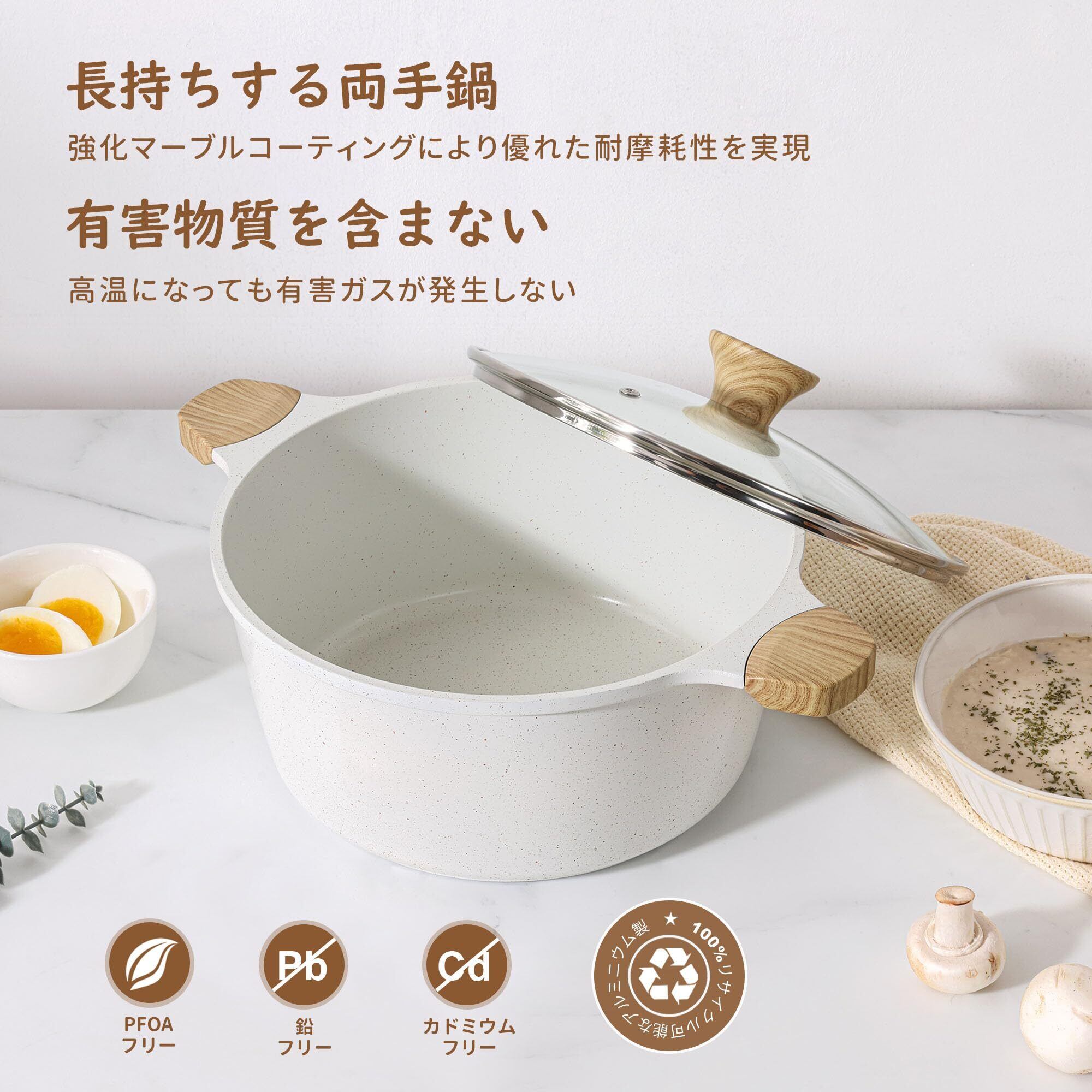 SENSARTE 両手鍋24cm 深型 鍋 卓上鍋 ih/ガス対応 焦げつかない マーブルコート 洗いやすい カレー鍋 揚げ鍋 鍋料理 パスタ鍋 ホワイト