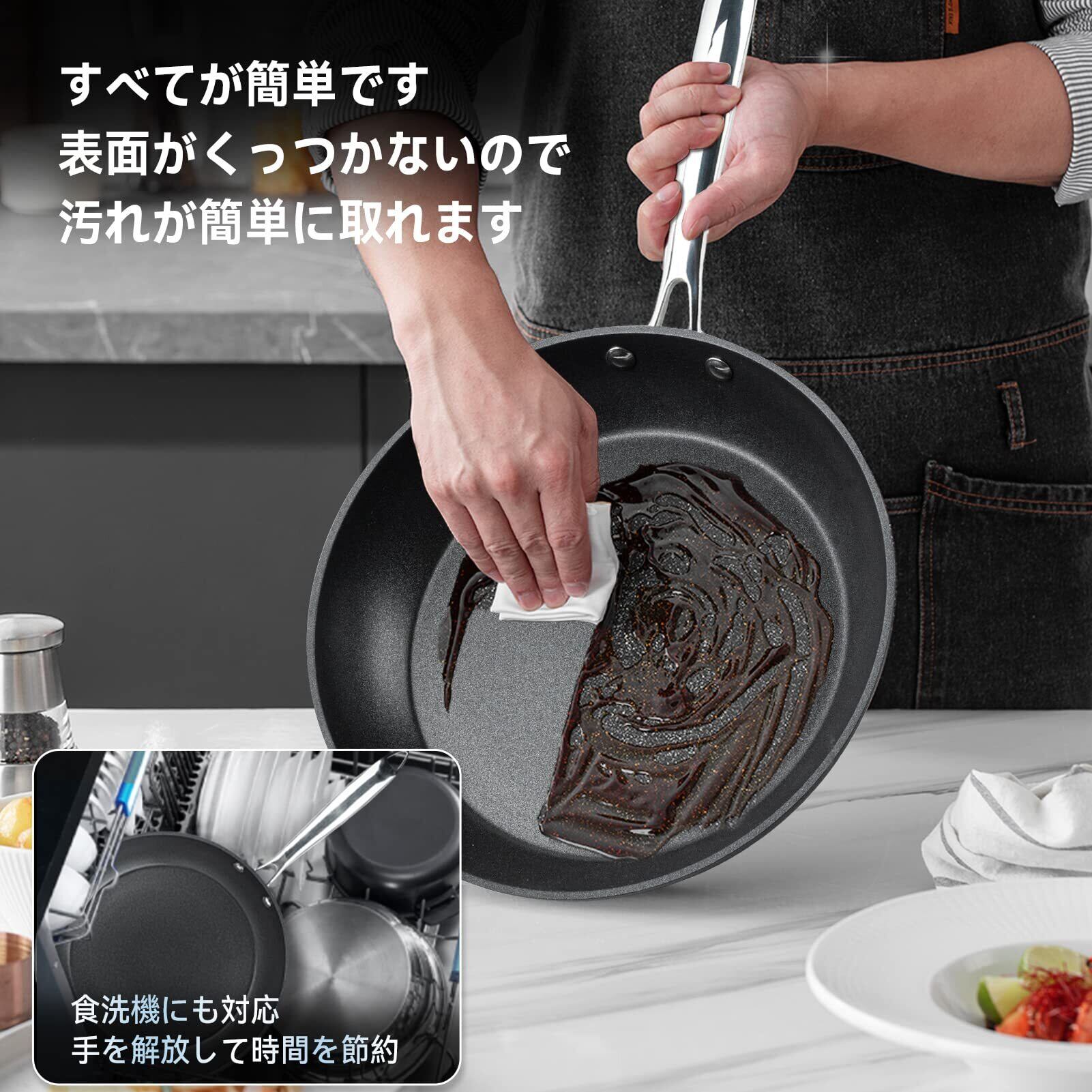 【焦げ付かない、お手入れの手間を省きます!】フライパンの優れたノンスティック効果により、ノンスティック表面から食品がスムーズに滑ります、調理がスムーズになります。フライパンのお手入れも簡単で、こすらずにスムーズに汚れを落とします。食器洗い乾燥機にも対応しています。