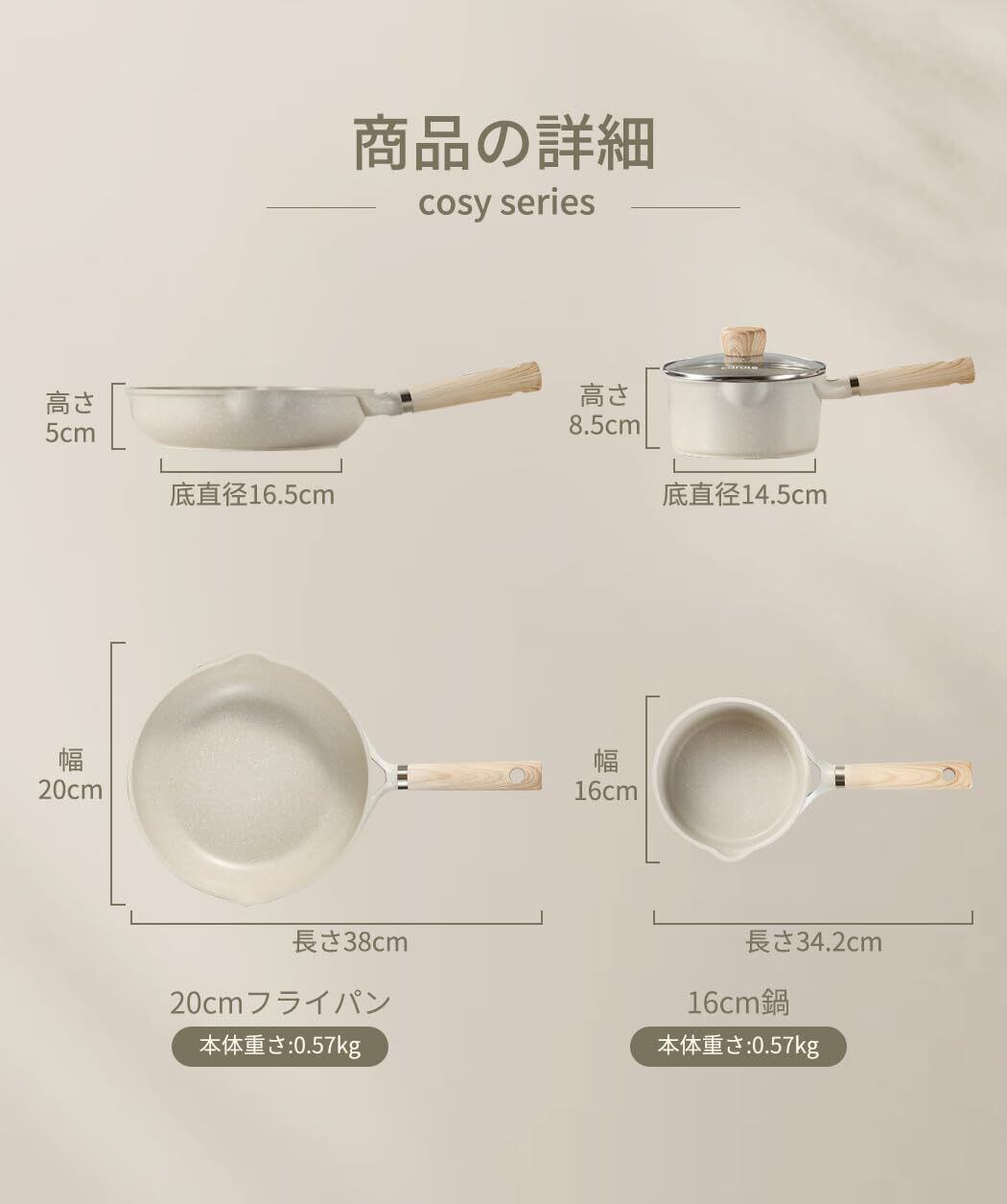 CAROTE カローテ フライパン セット 3点 16cm鍋+20cmフライパン 鍋セット IH&ガス火対応 PFOAなどの有害物質不使用 5層構造 マーブルコート 軽量 1人暮らしセット おしゃれ こびりつかずに お手入れ簡単 Cosyシリーズ 1年 グレージュ