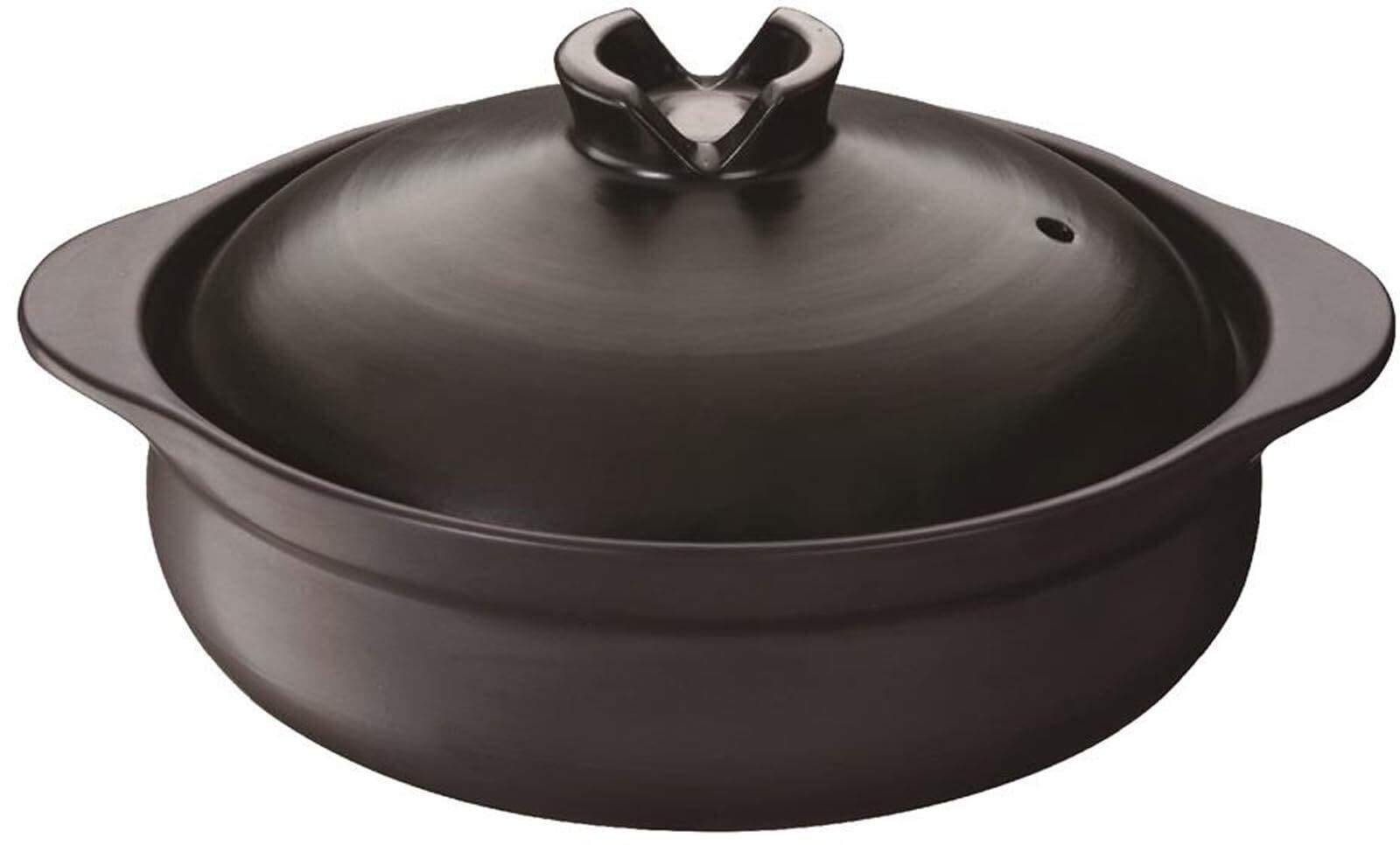 このイシガキ製の土鍋は、ガス火とIH電磁調理器の両方で使用できます。サイズは約29×24.5×13.5cm、容量は2.0Lで、重量は約1.6kgです。耐熱陶器で作られた本体と陶器製の蓋、ステンレス鋼製のIH用プレートを備えています。吹きこぼれにくく、4人前程度の分量に向いています。中国製で、ブラックの外装です。